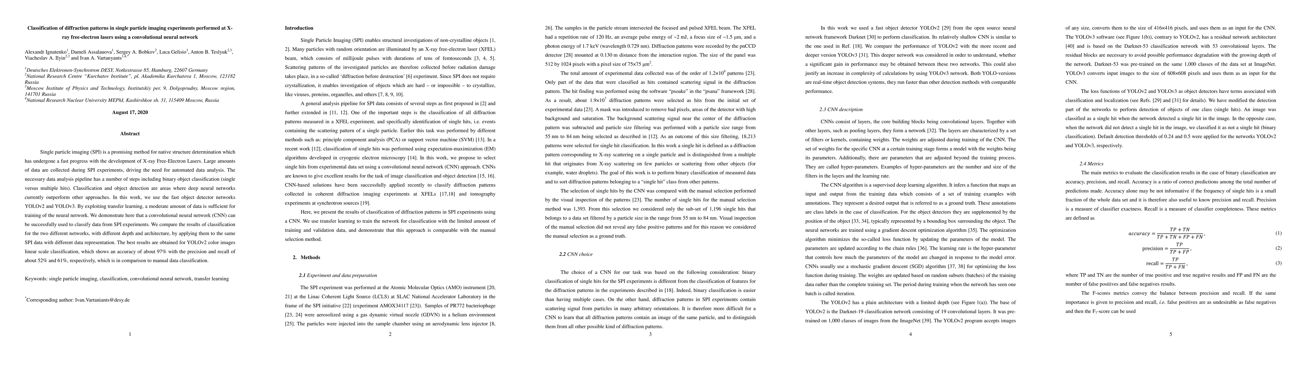 Researchers used convolutional neural networks to classify diffraction patterns in single particle imaging experiments with high accuracy, outperforming manual classification, and demonstrate the potential of automated data analysis in SPI experiments.