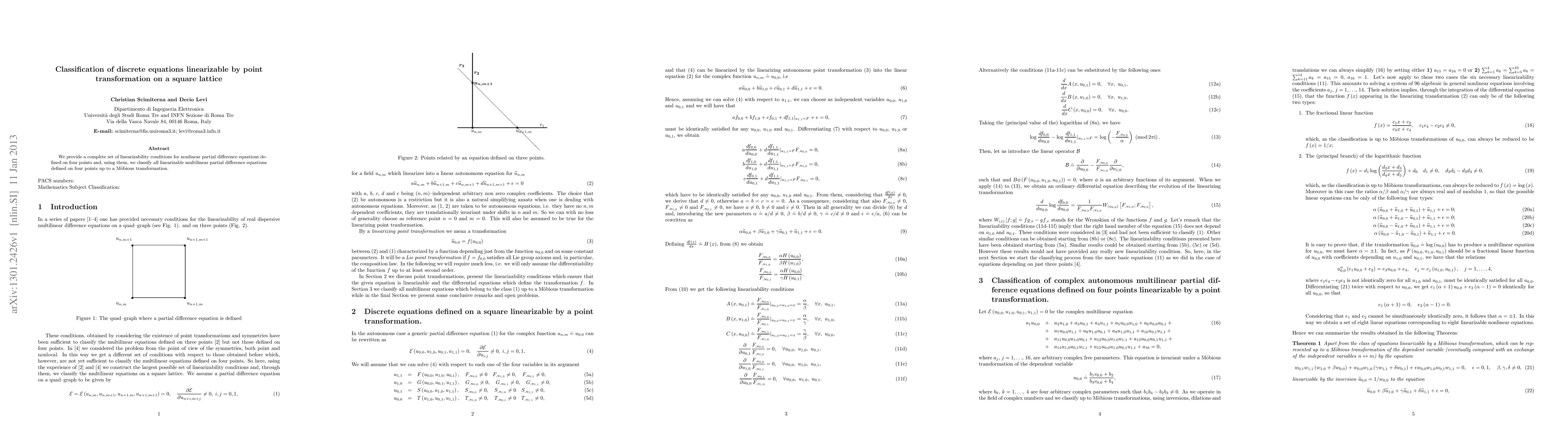 This paper presents a comprehensive set of conditions for linearizing nonlinear partial difference equations on a four-point square lattice, categorizing all linearizable multilinear equations under a Mobius transformation.