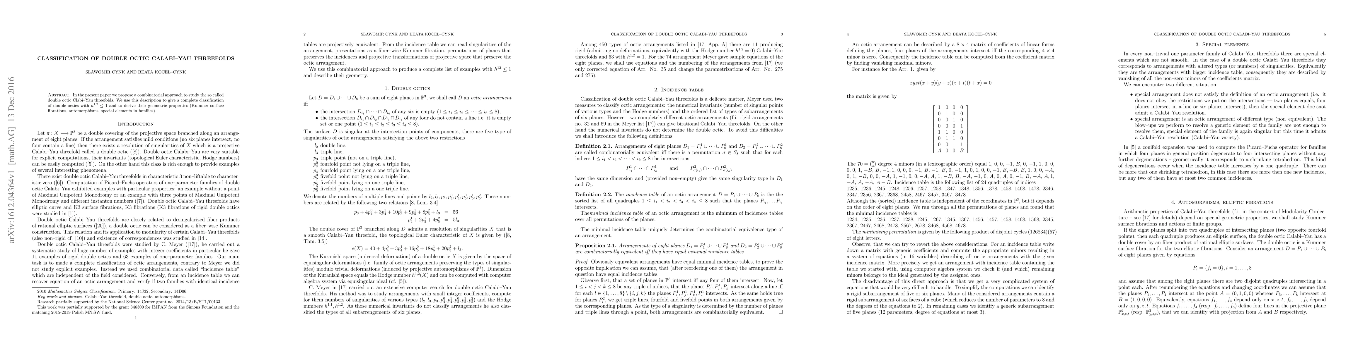This paper proposes a combinatorial method to classify double octic Calabi-Yau threefolds with $h^{1,2}\le1$, providing a complete classification and detailing their geometric properties, including Kummer surface fibrations and automorphisms.