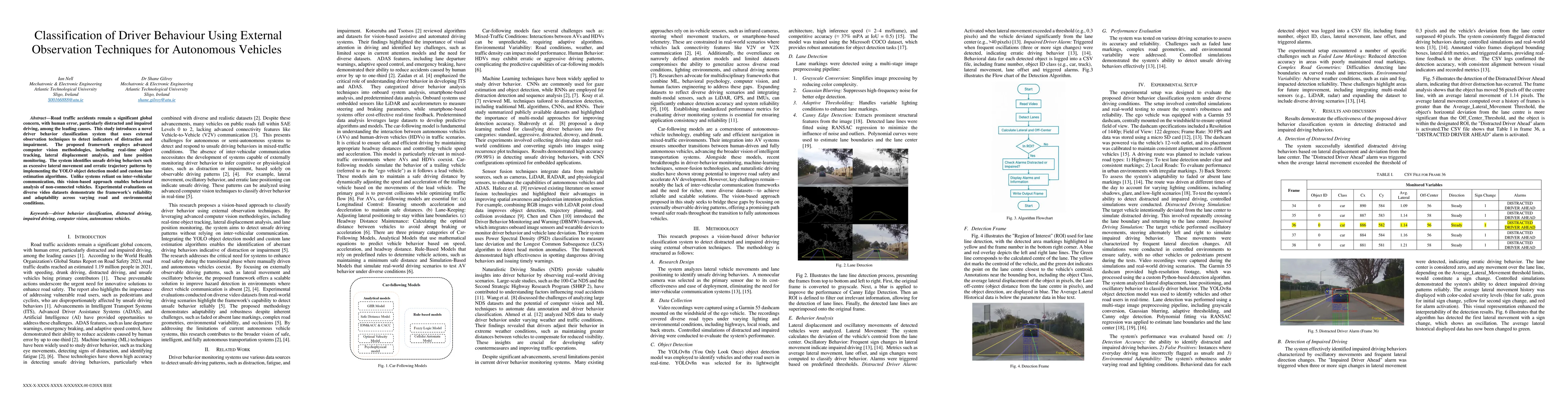 Road traffic accidents remain a significant global concern, with human error, particularly distracted and impaired driving, among the leading causes. This study introduces a novel driver behavior classification system that uses external observation techniques to detect indicators of distraction and impairment. The proposed framework employs advanced computer vision methodologies, including real-time object tracking, lateral displacement analysis, and lane position monitoring. The system identifies unsafe driving behaviors such as excessive lateral movement and erratic trajectory patterns by implementing the YOLO object detection model and custom lane estimation algorithms. Unlike systems reliant on inter-vehicular communication, this vision-based approach enables behavioral analysis of non-connected vehicles. Experimental evaluations on diverse video datasets demonstrate the framework's reliability and adaptability across varying road and environmental conditions.