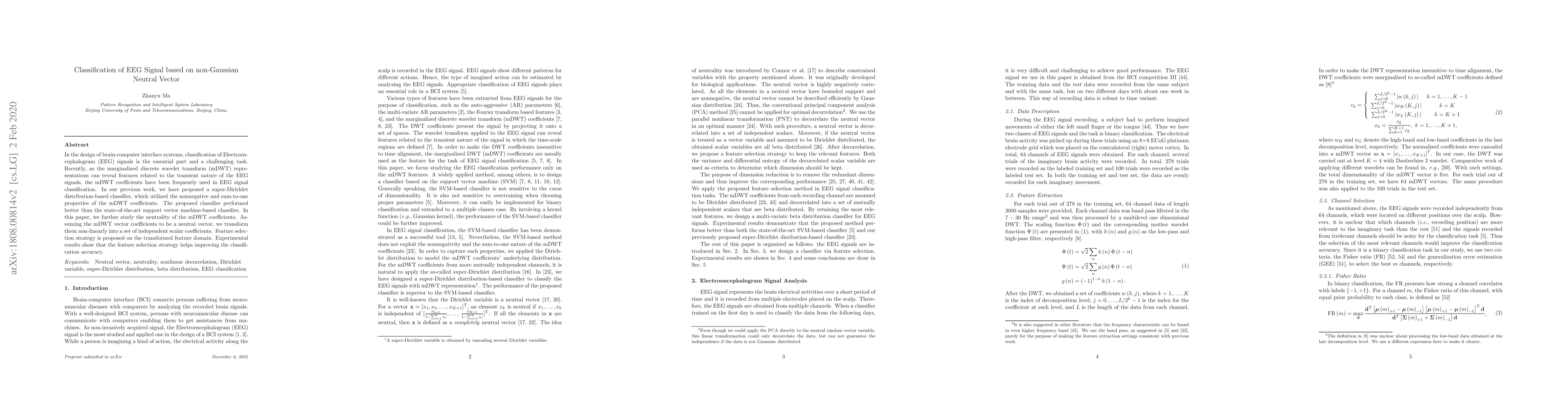 This paper proposes a novel classification method for EEG signals using non-Gaussian neutral vector transformation of marginalized discrete wavelet transform (mDWT) coefficients, outperforming existing support vector machine-based classifiers. The method enhances classification accuracy through a feature selection strategy on the transformed feature domain.