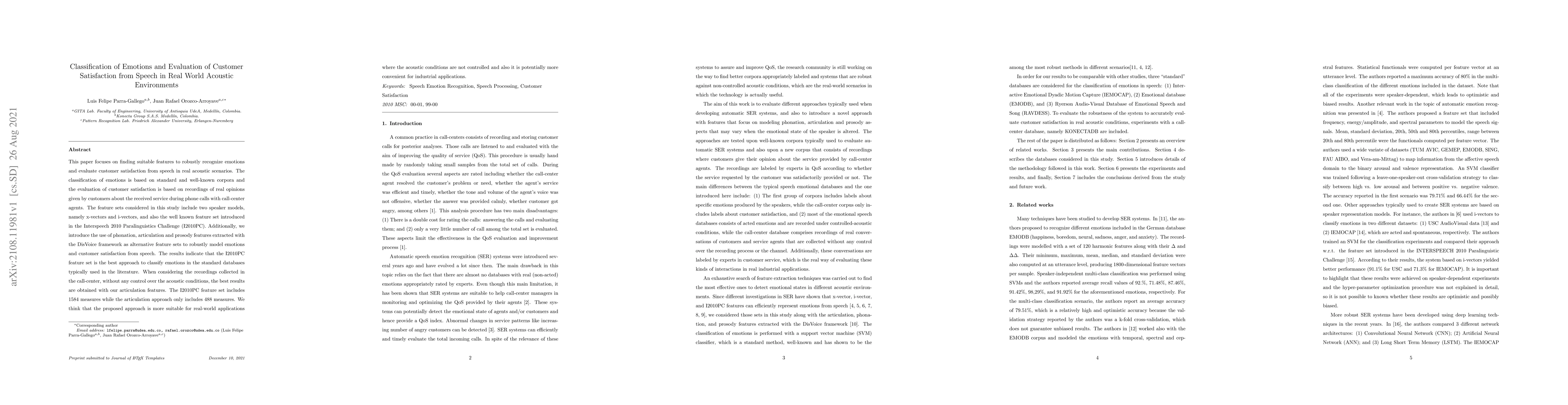 This paper explores various feature sets to classify emotions and evaluate customer satisfaction from speech in uncontrolled acoustic environments, finding that articulation features perform best in real-world call-center scenarios, while the I2010PC feature set excels in standard databases.