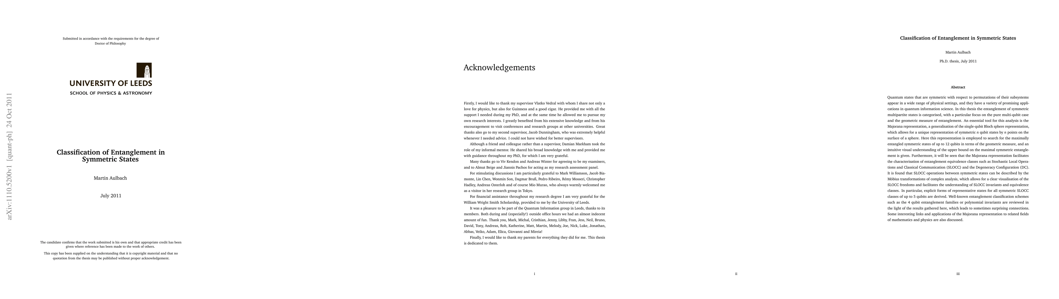 Quantum states that are symmetric with respect to permutations of their subsystems appear in a wide range of physical settings, and they have a variety of promising applications in quantum information science. In this thesis the entanglement of symmetric multipartite states is categorised, with a particular focus on the pure multi-qubit case and the geometric measure of entanglement. An essential tool for this analysis is the Majorana representation, a generalisation of the single-qubit Bloch sphere representation, which allows for a unique representation of symmetric n qubit states by n points on the surface of a sphere. Here this representation is employed to search for the maximally entangled symmetric states of up to 12 qubits in terms of the geometric measure, and an intuitive visual understanding of the upper bound on the maximal symmetric entanglement is given. Furthermore, it will be seen that the Majorana representation facilitates the characterisation of entanglement equivalence classes such as Stochastic Local Operations and Classical Communication (SLOCC) and the Degeneracy Configuration (DC). It is found that SLOCC operations between symmetric states can be described by the Mobius transformations of complex analysis, which allows for a clear visualisation of the SLOCC freedoms and facilitates the understanding of SLOCC invariants and equivalence classes. In particular, explicit forms of representative states for all symmetric SLOCC classes of up to 5 qubits are derived. Well-known entanglement classification schemes such as the 4 qubit entanglement families or polynomial invariants are reviewed in the light of the results gathered here, which leads to sometimes surprising connections. Some interesting links and applications of the Majorana representation to related fields of mathematics and physics are also discussed.