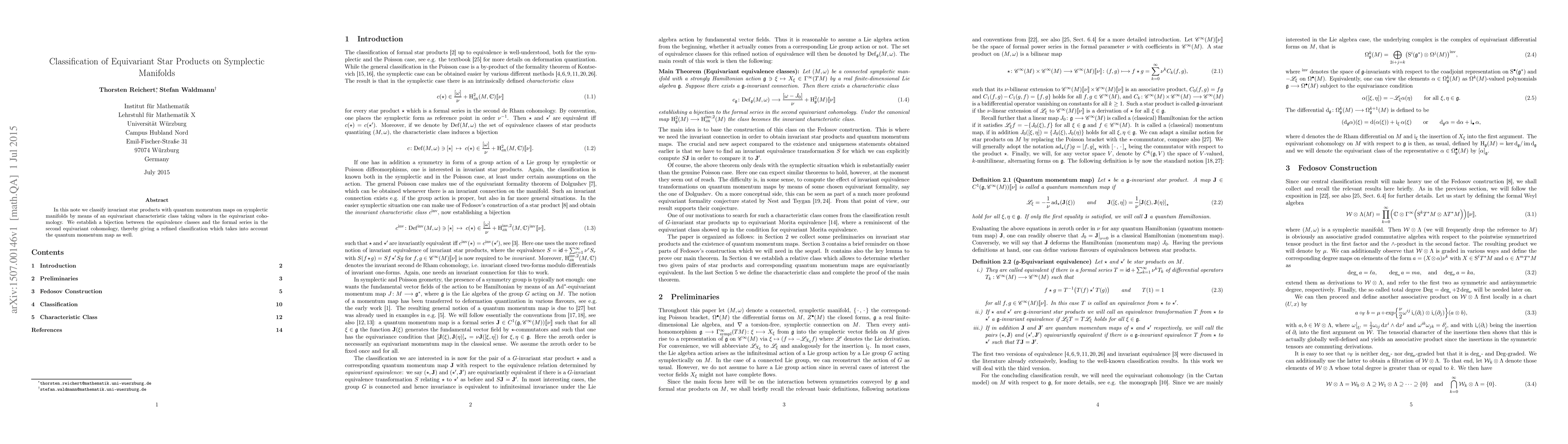 This paper classifies invariant star products on symplectic manifolds using an equivariant characteristic class in equivariant cohomology, establishing a refined bijection with formal series in the second equivariant cohomology that incorporates quantum momentum maps.