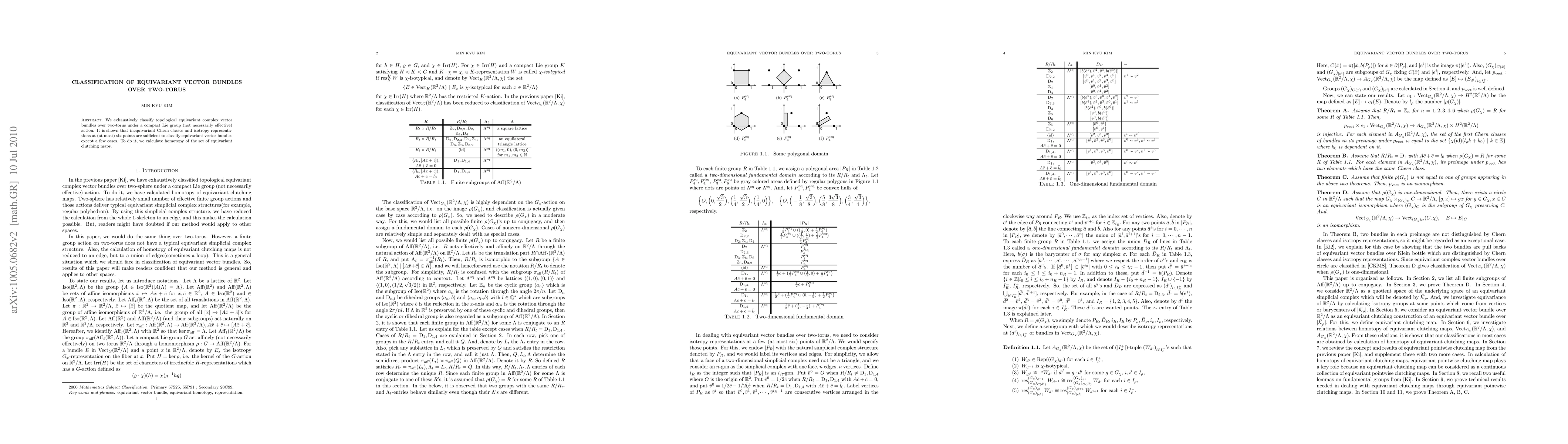 We exhaustively classify topological equivariant complex vector bundles over two-torus under a compact Lie group (not necessarily effective) action. It is shown that inequivariant Chern classes and isotropy representations at (at most) six points are sufficient to classify equivariant vector bundles except a few cases. To do it, we calculate homotopy of the set of equivariant clutching maps. And, classification on real projective plane, Klein bottle will appear soon