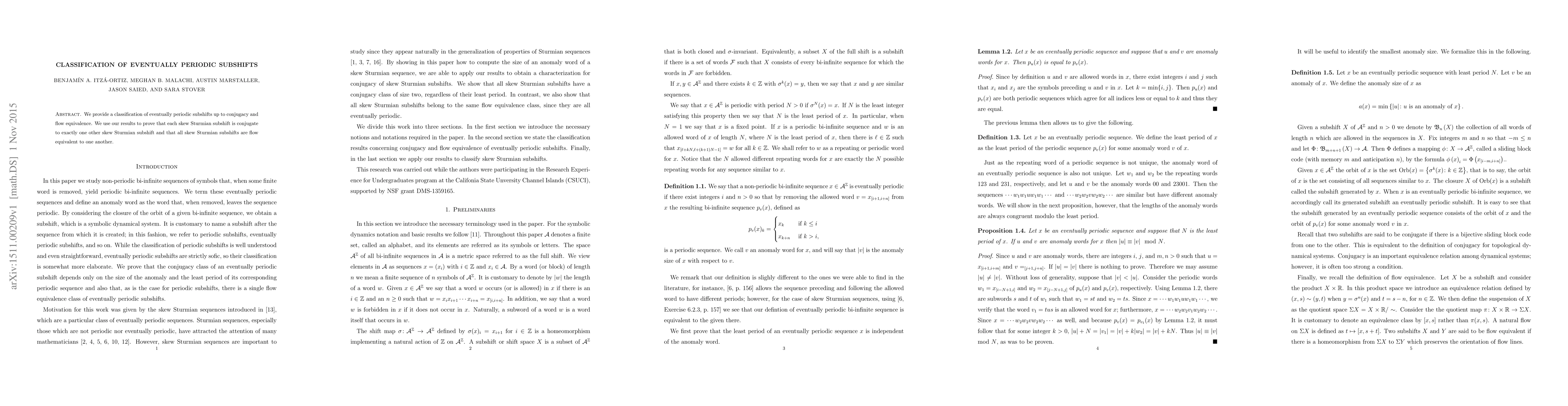 This paper classifies eventually periodic subshifts up to conjugacy and flow equivalence, proving that each skew Sturmian subshift is conjugate to exactly one other skew Sturmian subshift and that all such subshifts are flow equivalent.