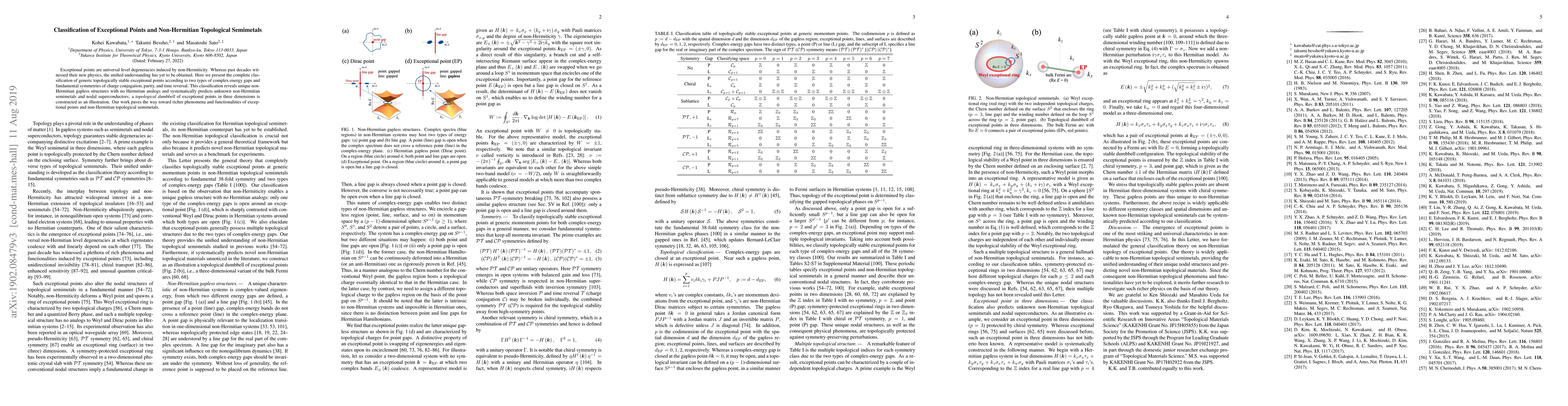 This paper classifies exceptional points in non-Hermitian systems, revealing unique topological structures and predicting new non-Hermitian semimetals and superconductors. The classification involves complex-energy gaps and symmetries, offering insights into potential applications of these phenomena.