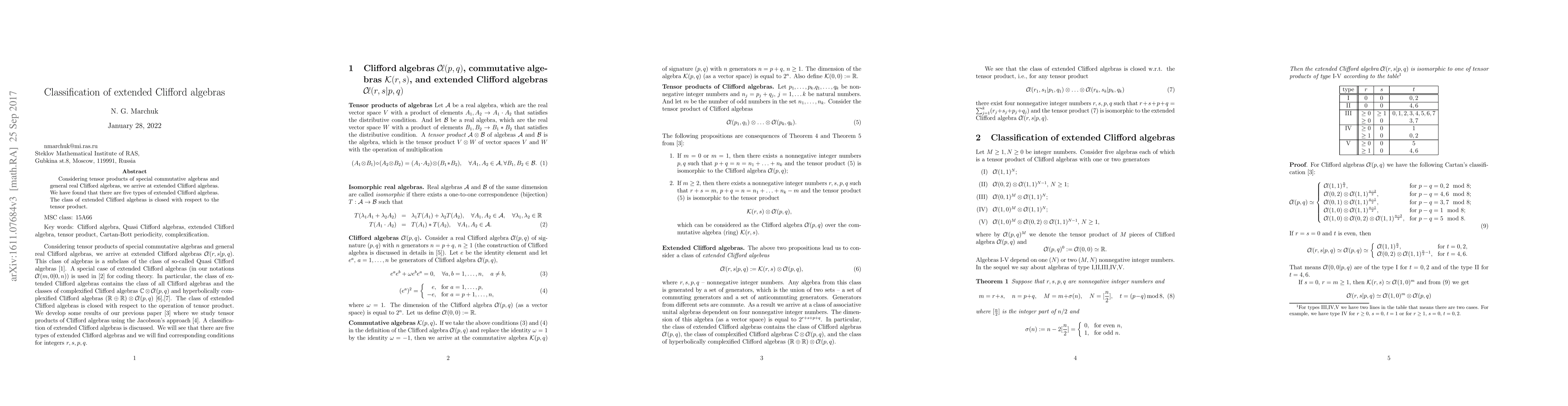 The paper classifies five distinct types of extended Clifford algebras, derived from tensor products of special commutative algebras and general real Clifford algebras, establishing their closure under tensor product operations.