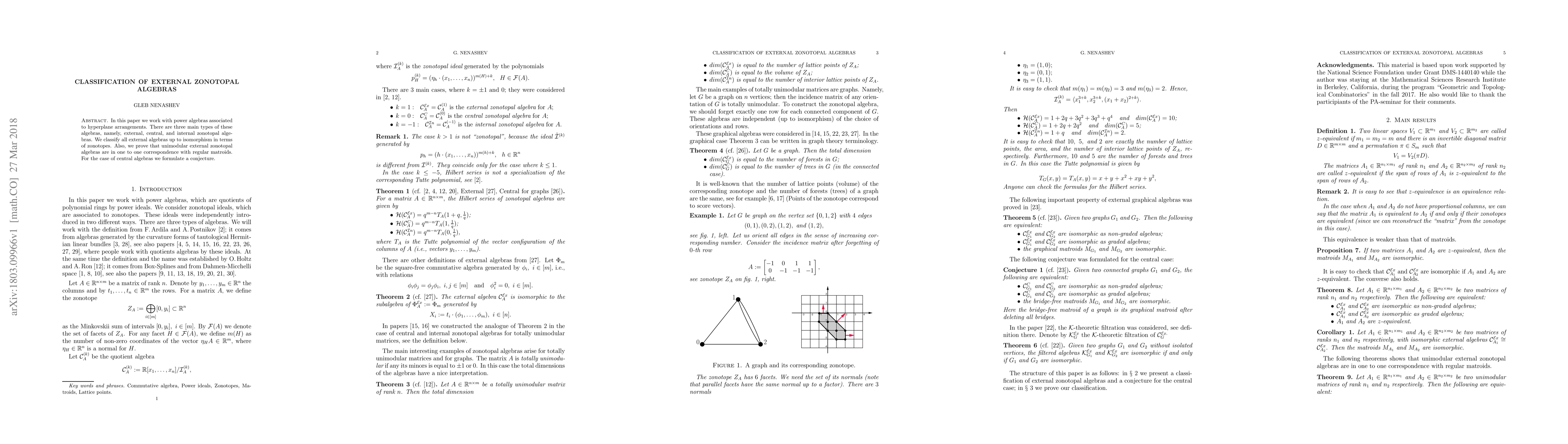 In this paper we work with power algebras associated to hyperplane arrangements. There are three main types of these algebras, namely, external, central, and internal zonotopal algebras. We classify all external algebras up to isomorphism in terms of zonotopes. Also, we prove that unimodular external zonotopal algebras are in one to one correspondence with regular matroids. For the case of central algebras we formulate a conjecture.