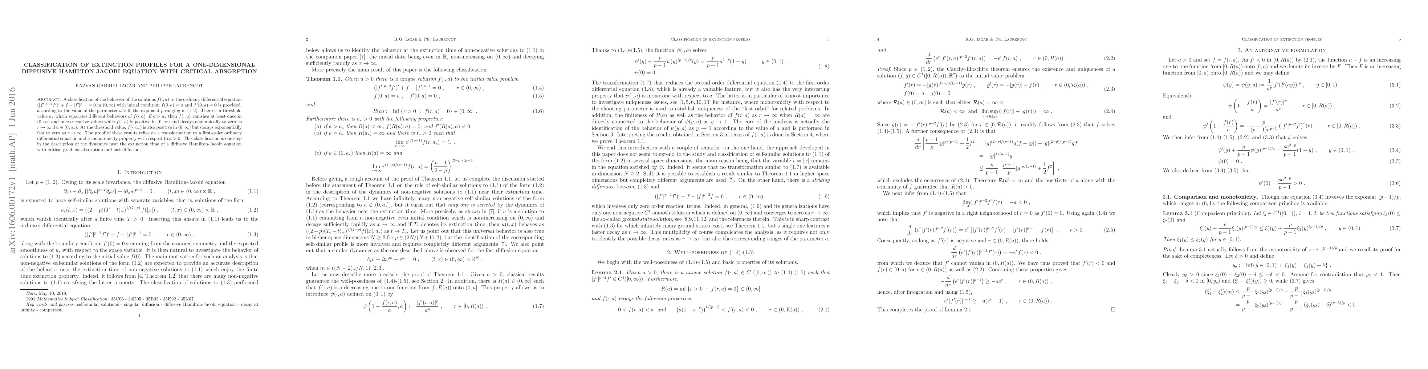 A classification of the behavior of the solutions $f(\cdot,a)$ to the ordinary differential equation $(|f'|^{p-2} f')' + f - |f'|^{p-1} = 0$ in $(0,\infty)$ with initial condition $f(0,a)=a$ and $f'(0,a)=0$ is provided, according to the value of the parameter $a>0$, the exponent $p$ ranging in $(1,2)$. There is a threshold value $a_*$ which separates different behaviors of $f(\cdot,a)$: if $a>a_*$ then $f(\cdot,a)$ vanishes at least once in $(0,\infty)$ and takes negative values while $f(\cdot,a)$ is positive in $(0,\infty)$ and decays algebraically to zero as $r\to\infty$ if $a\in (0,a_*)$. At the threshold value, $f(\cdot,a_*)$ is also positive in $(0,\infty)$ but decays exponentially fast to zero as $r\to\infty$. The proof of these results relies on a transformation to a first-order ordinary differential equation and a monotonicity property with respect to $a>0$. This classification is one step in the description of the dynamics near the extinction time of a diffusive Hamilton-Jacobi equation with critical gradient absorption and fast diffusion.