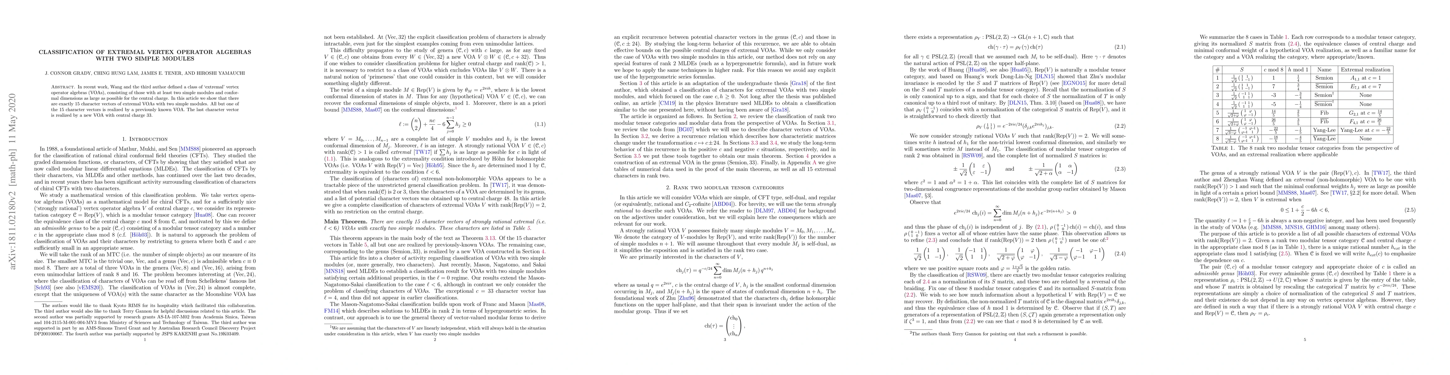 This paper classifies extremal vertex operator algebras with exactly two simple modules, identifying 15 distinct character vectors. All but one of these are realized by known VOAs, while the remaining one corresponds to a new VOA with a central charge of 33.
