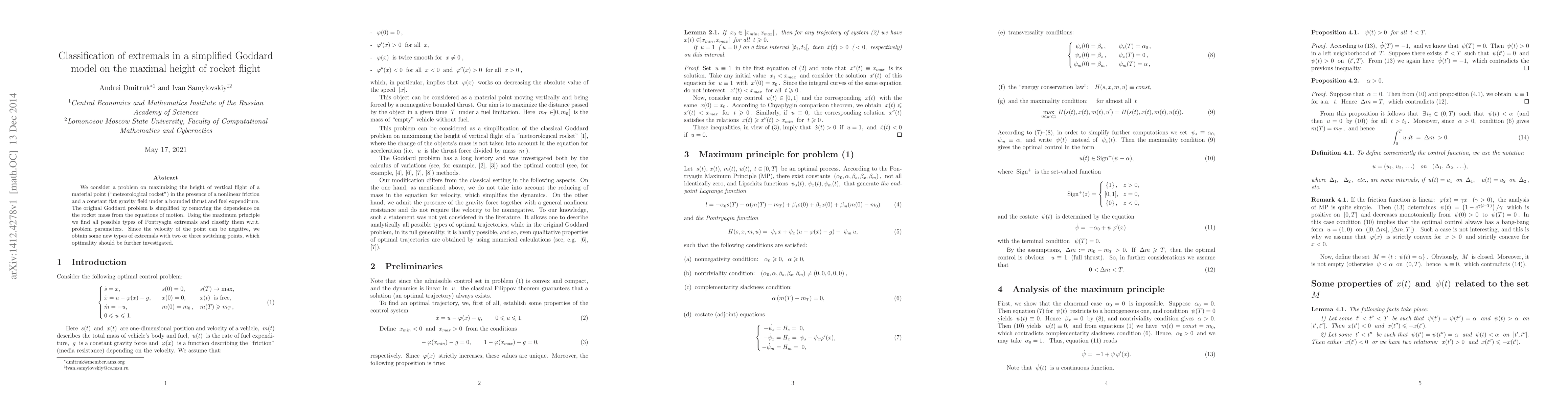We consider a problem on maximizing the height of vertical flight of a material point ("meteorological rocket") in the presence of a nonlinear friction and a constant flat gravity field under a bounded thrust and fuel expenditure. The original Goddard problem is simplified by removing the dependence on the rocket mass from the equations of motion. Using the maximum principle we find all possible types of Pontryagin extremals and classify them w.r.t. problem parameters. Since the velocity of the point can be negative, we obtain some new types of extremals with two or three switching points, which optimality should be further investigated.