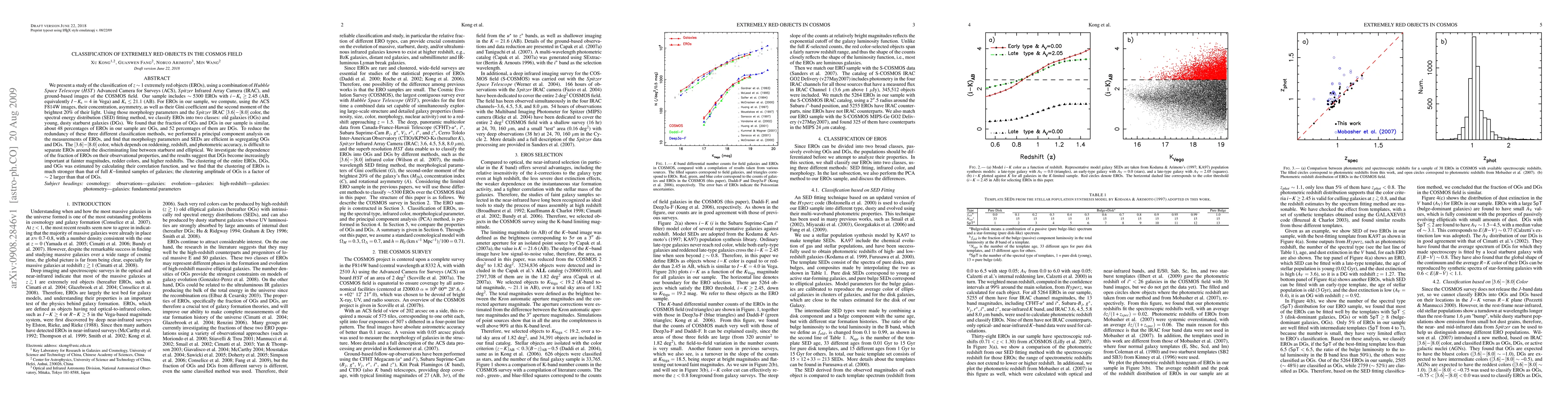 This paper classifies extremely red objects (EROs) in the COSMOS field using HST, Spitzer, and ground-based imaging data, finding that 48% are old galaxies and 52% are dusty starburst galaxies. Morphology and SED fitting methods effectively distinguish these classes, though the [3.6]-[8.0] color is less reliable near the starburst-elliptical boundary.