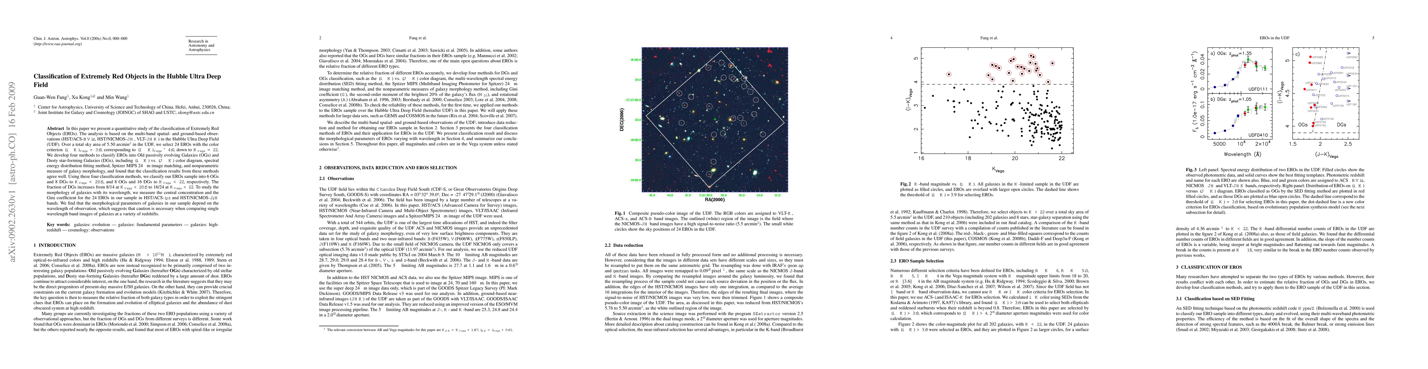 In this paper we present a quantitative study of the classification of Extremely Red Objects (EROs). The analysis is based on the multi-band spatial- and ground-based observations (HST/ACS-$BViz$, HST/NICMOS-$JH$, VLT-$JHK$) in the Hubble Ultra Deep Field (UDF). Over a total sky area of 5.50 arcmin$^2$ in the UDF, we select 24 EROs with the color criterion $(i-K)_{\rm Vega}>3.9$, corresponding to $(I-K)_{\rm Vega}\gsim4.0$, down to $\Kv=22$. We develop four methods to classify EROs into Old passively evolving Galaxies (OGs) and Dusty star-forming Galaxies (DGs), including $(i-K)$ vs. $(J-K)$ color diagram, spectral energy distribution fitting method, Spitzer MIPS 24 $\mu$m image matching, and nonparametric measure of galaxy morphology, and found that the classification results from these methods agree well. Using these four classification methods, we classify our EROs sample into 6 OGs and 8 DGs to $\Kv<20.5$, and 8 OGs and 16 DGs to $\Kv<22$, respectively. The fraction of DGs increases from 8/14 at $\Kv<20.5$ to 16/24 at $\Kv<22$. To study the morphology of galaxies with its wavelength, we measure the central concentration and the Gini coefficient for the 24 EROs in our sample in HST/ACS-$i,z$ and HST/NICMOS-$J,H$ bands. We find that the morphological parameters of galaxies in our sample depend on the wavelength of observation, which suggests that caution is necessary when comparing single wavelength band images of galaxies at a variety of redshifts.