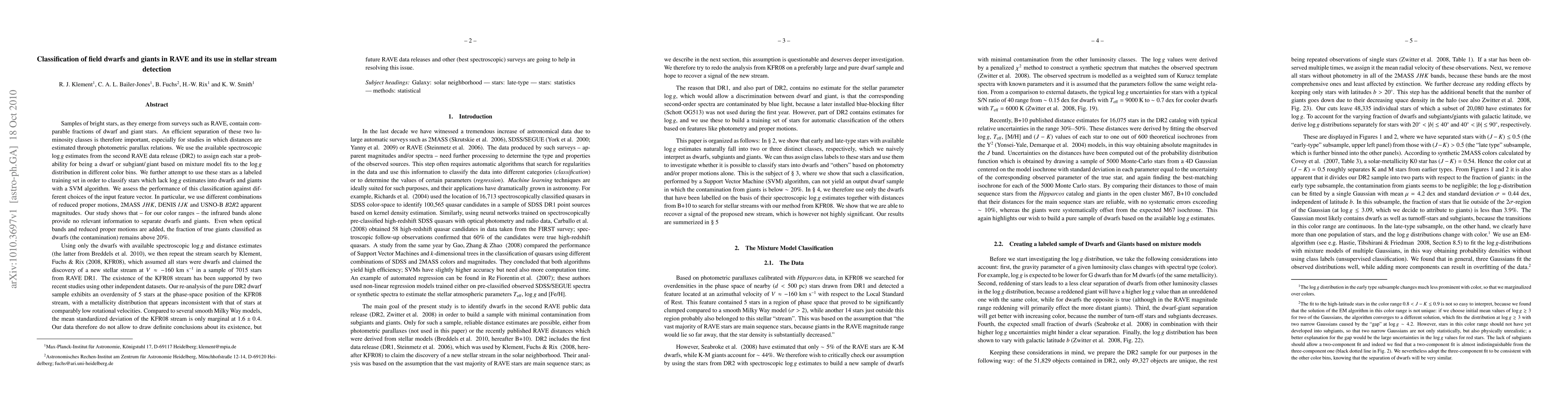 An efficient separation between dwarfs and giants in surveys of bright stars is important, especially for studies in which distances are estimated through photometric parallax relations. We use the available spectroscopic log g estimates from the second RAVE data release (DR2) to assign each star a probability for being a dwarf or subgiant/giant based on mixture model fits to the log g distribution in different color bins. We further attempt to use these stars as a labeled training set in order to classify stars which lack log g estimates into dwarfs and giants with a SVM algorithm. We assess the performance of this classification against different choices of the input feature vector. In particular, we use different combinations of reduced proper motions, 2MASS JHK, DENIS IJK and USNO-B B2R2 apparent magnitudes. Our study shows that -- for our color ranges -- the infrared bands alone provide no relevant information to separate dwarfs and giants. Even when optical bands and reduced proper motions are added, the fraction of true giants classified as dwarfs (the contamination) remains above 20%. Using only the dwarfs with available spectroscopic log g and distance estimates (the latter from Breddels et al. 2010), we then repeat the stream search by Klement, Fuchs & Rix (2008, KFR08), which assumed all stars were dwarfs and claimed the discovery of a new stellar stream at V = -160 km/s in a sample of 7015 stars from RAVE DR1. Our re-analysis of the pure DR2 dwarf sample exhibits an overdensity of 5 stars at the phase-space position of the KFR08 stream, with a metallicity distribution that appears inconsistent with that of stars at comparably low rotational velocities. Compared to several smooth Milky Way models, the mean standardized deviation of the KFR08 stream is only marginal at 1.6$\pm$0.4... (abbreviated)