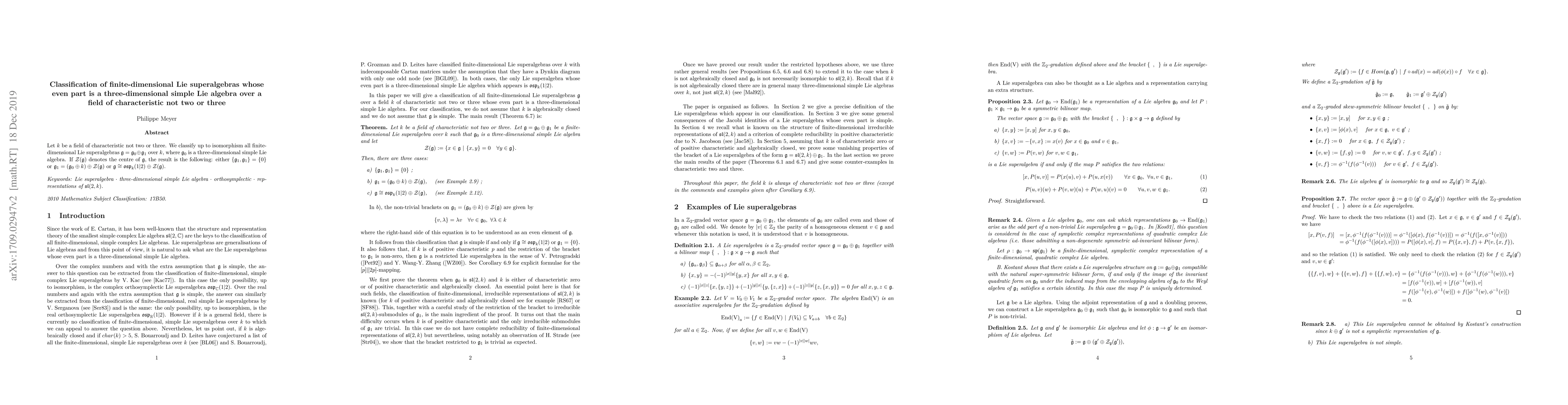 Let $k$ be a field of characteristic not two or three. We classify up to isomorphism all finite-dimensional Lie superalgebras $\mathfrak{g}=\mathfrak{g}_0\oplus \mathfrak{g}_1$ over $k$, where $\mathfrak{g}_0$ is a three-dimensional simple Lie algebra. If $\mathcal{Z}(\mathfrak{g})$ denotes the centre of $\mathfrak{g}$, the result is the following: either $\lbrace \mathfrak{g}_1,\mathfrak{g}_1 \rbrace=\lbrace 0 \rbrace$ or $\mathfrak{g}_1=(\mathfrak{g}_0 \oplus k)\oplus \mathcal{Z}(\mathfrak{g})$ or $\mathfrak{g}\cong \mathfrak{osp}_k(1|2)\oplus \mathcal{Z}(\mathfrak{g})$.