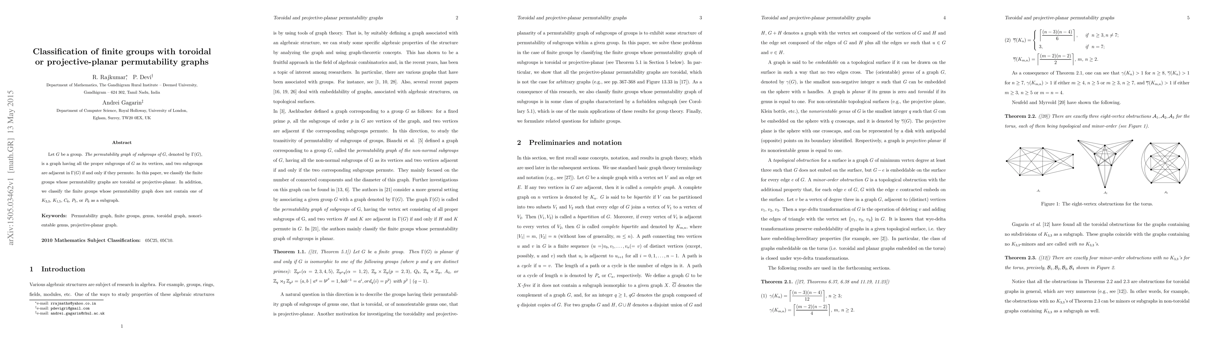 This paper classifies finite groups whose permutability graphs are either toroidal or projective-planar, and also identifies those whose permutability graphs exclude specific subgraphs including $K_{3,3}$, $K_{1,5}$, $C_6$, $P_5$, or $P_6$.