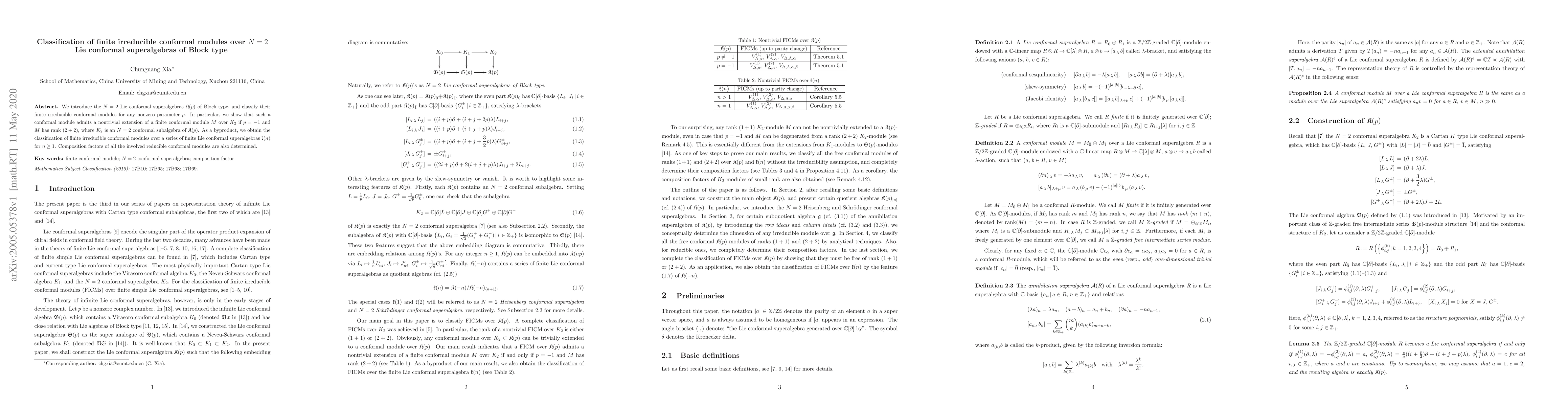This paper classifies finite irreducible conformal modules for $N=2$ Lie conformal superalgebras ${\frak {K}}(p)$ of Block type, showing nontrivial extensions for $p=-1$. It also classifies modules for a series of finite Lie conformal superalgebras ${\frak k}(n)$ for $n\ge1$ and determines the composition factors of involved reducible modules.