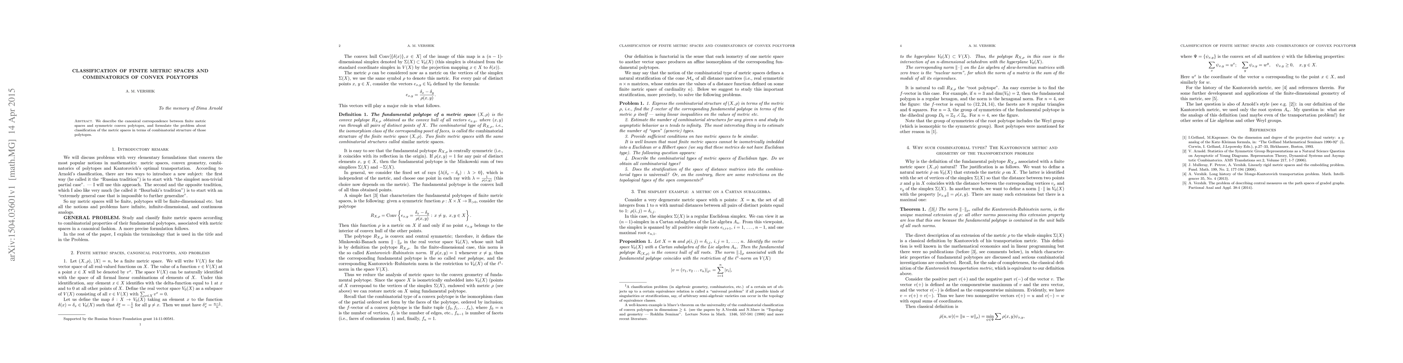 This paper establishes a canonical correspondence between finite metric spaces and special symmetric convex polytopes, aiming to classify metric spaces through the combinatorial structure of these polytopes.
