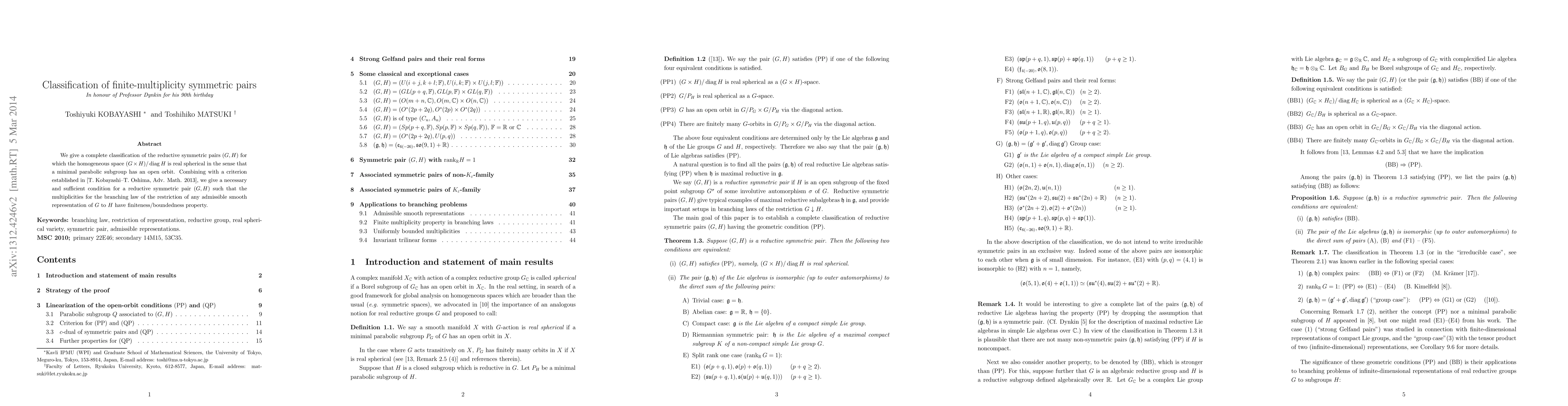 The research paper classifies reductive symmetric pairs of groups where a minimal parabolic subgroup has an open orbit, providing a necessary and sufficient condition for finiteness/boundedness of branching law multiplicities.