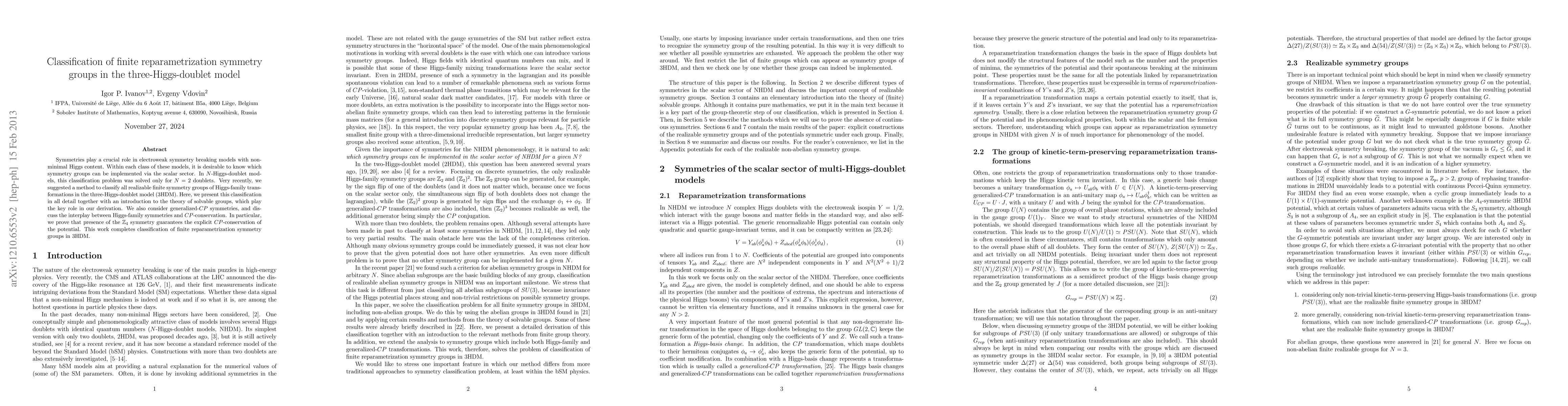 Symmetries play a crucial role in electroweak symmetry breaking models with non-minimal Higgs content. Within each class of these models, it is desirable to know which symmetry groups can be implemented via the scalar sector. In N-Higgs-doublet models, this classification problem was solved only for N=2 doublets. Very recently, we suggested a method to classify all realizable finite symmetry groups of Higgs-family transformations in the three-Higgs-doublet model (3HDM). Here, we present this classification in all detail together with an introduction to the theory of solvable groups, which play the key role in our derivation. We also consider generalized-CP symmetries, and discuss the interplay between Higgs-family symmetries and CP-conservation. In particular, we prove that presence of the Z_4 symmetry guarantees the explicit CP-conservation of the potential. This work completes classification of finite reparametrization symmetry groups in 3HDM.
