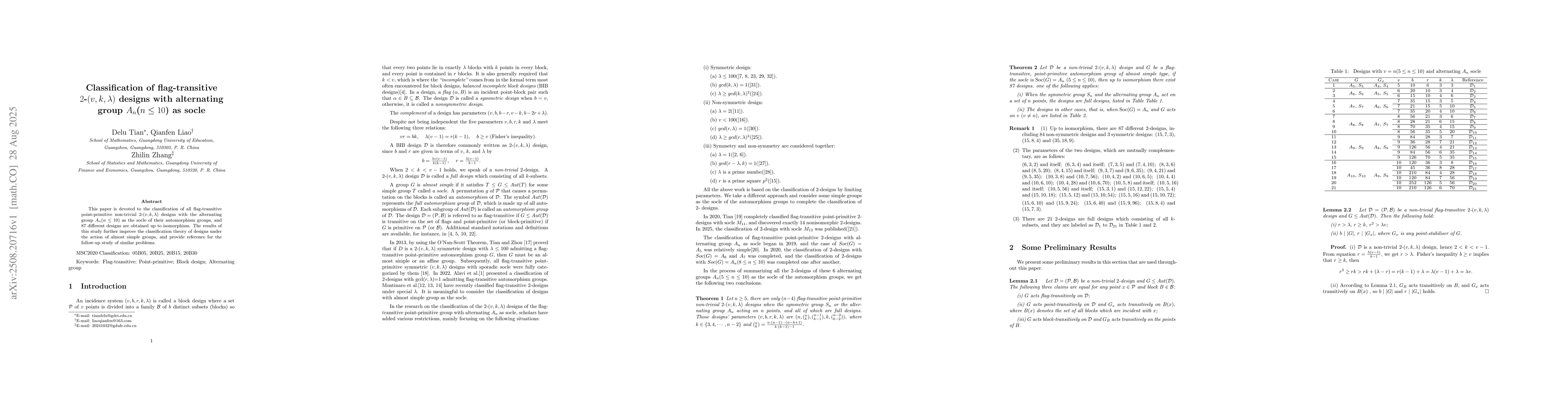 This paper is devoted to the classification of all flag-transitive point-primitive non-trivial $2$-$(v, k, \lambda)$ designs with the alternating group $A_n$($n \le 10$) as the socle of their automorphism groups, and 87 different designs are obtained up to isomorphism. The results of this study further improve the classification theory of designs under the action of almost simple groups, and provide reference for the follow-up study of similar problems.
