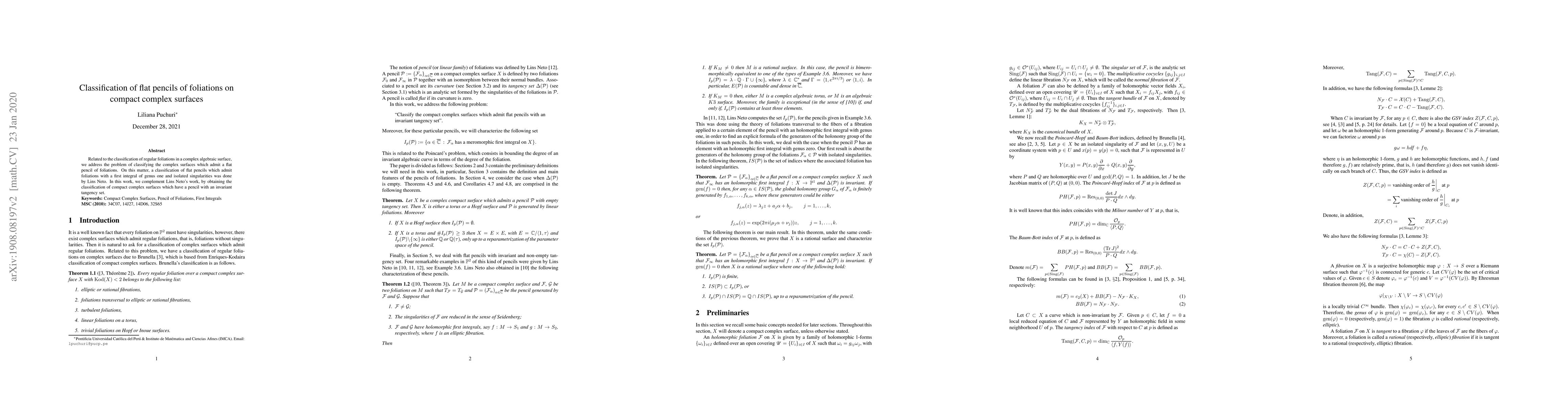 Related to the classification of regular foliations in a complex algebraic surface, we address the problem of classifying the complex surfaces which admit a flat pencil of foliations. On this matter, a classification of flat pencils which admit foliations with a first integral of genus one and isolated singularities was done by Lins Neto. In this work, we complement Lins Neto's work, by obtaining the classification of compact complex surfaces which have a pencil with an invariant tangency set.