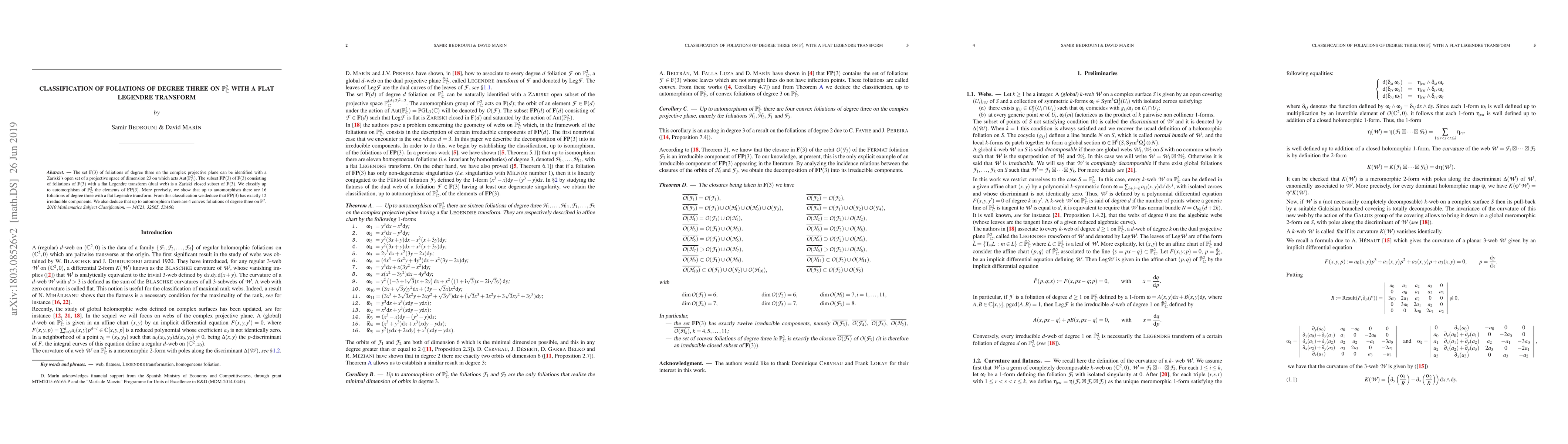 The paper classifies foliations of degree three on the complex projective plane with a flat Legendre transform, finding 16 distinct types up to automorphism. It reveals that the subset with such transforms has exactly 12 irreducible components and identifies 4 convex foliations among them.