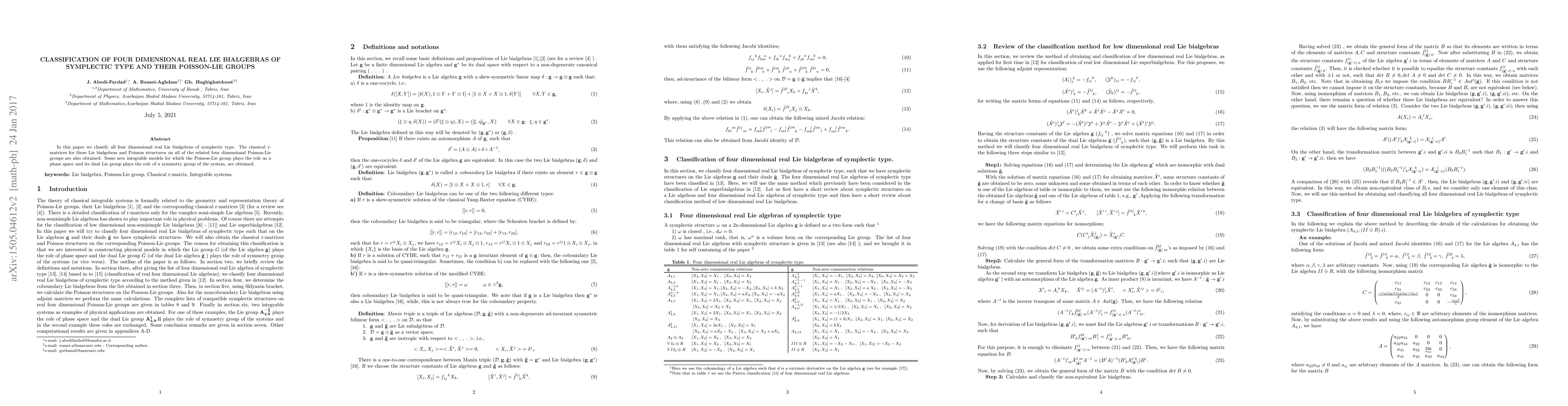In this paper we classify all four dimensional real Lie bialgebras of symplectic type. The classical r- matrices for these Lie bialgebras and Poisson structures on all of the related four dimensional Poisson-Lie groups are also obtained. Some new integrable models for which the Poisson-Lie group plays the role as a phase space and its dual Lie group plays the role of a symmetry group of the system, are obtained.