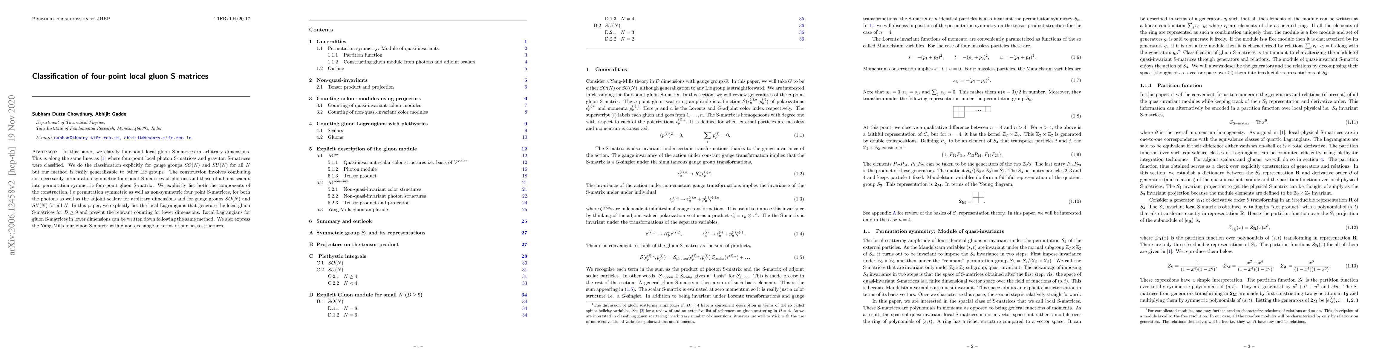 Researchers classify four-point local gluon S-matrices for gauge groups $SO(N)$ and $SU(N)$ in arbitrary dimensions, providing a new method for constructing these matrices and understanding their properties.
