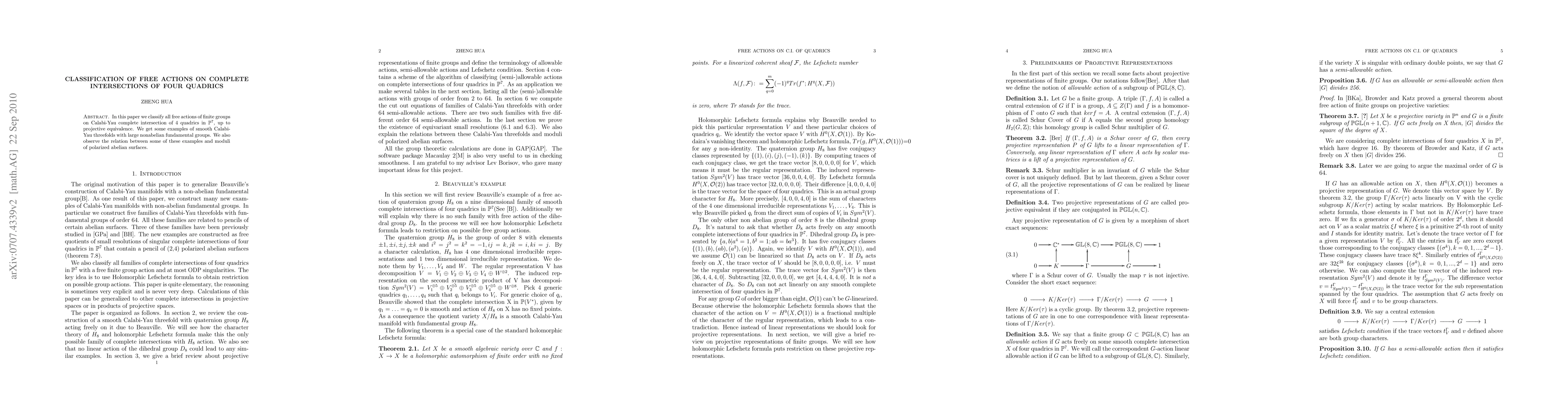 This paper classifies all free actions of finite groups on Calabi-Yau complete intersections of four quadrics in $\PP^7$, yielding examples of smooth Calabi-Yau threefolds with large nonabelian fundamental groups and connections to moduli of polarized abelian surfaces.