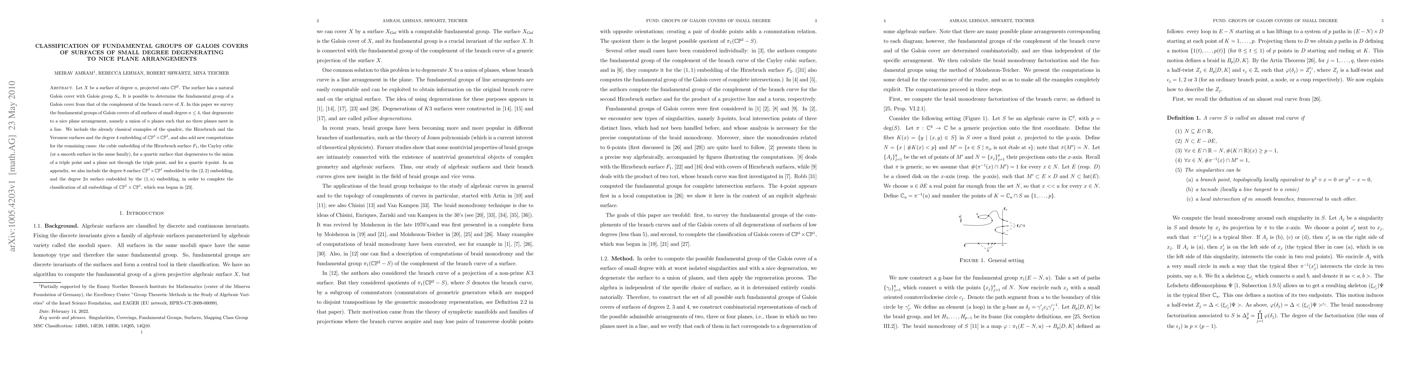 Let $X$ be a surface of degree $n$, projected onto $\mathbb{CP}^2$. The surface has a natural Galois cover with Galois group $S_n.$ It is possible to determine the fundamental group of a Galois cover from that of the complement of the branch curve of $X.$ In this paper we survey the fundamental groups of Galois covers of all surfaces of small degree $n \leq 4$, that degenerate to a nice plane arrangement, namely a union of $n$ planes such that no three planes meet in a line. We include the already classical examples of the quadric, the Hirzebruch and the Veronese surfaces and the degree $4$ embedding of $\mathbb{CP}^1 \times \mathbb{CP}^1,$ and also add new computations for the remaining cases: the cubic embedding of the Hirzebruch surface $F_1$, the Cayley cubic (or a smooth surface in the same family), for a quartic surface that degenerates to the union of a triple point and a plane not through the triple point, and for a quartic $4$-point. In an appendix, we also include the degree $8$ surface $\mathbb{CP}^1\times \mathbb{CP}^1$ embedded by the $(2,2)$ embedding, and the degree $2n$ surface embedded by the $(1,n)$ embedding, in order to complete the classification of all embeddings of $\mathbb{CP}^1 \times \mathbb{CP}^1,$ which was begun in \cite{15}.