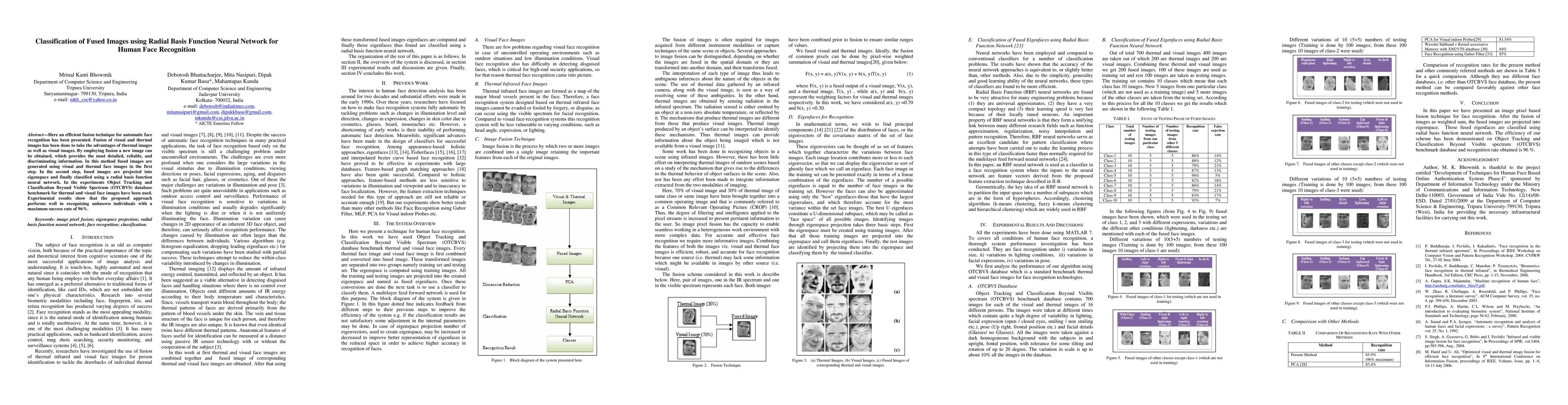 Here an efficient fusion technique for automatic face recognition has been presented. Fusion of visual and thermal images has been done to take the advantages of thermal images as well as visual images. By employing fusion a new image can be obtained, which provides the most detailed, reliable, and discriminating information. In this method fused images are generated using visual and thermal face images in the first step. In the second step, fused images are projected into eigenspace and finally classified using a radial basis function neural network. In the experiments Object Tracking and Classification Beyond Visible Spectrum (OTCBVS) database benchmark for thermal and visual face images have been used. Experimental results show that the proposed approach performs well in recognizing unknown individuals with a maximum success rate of 96%.