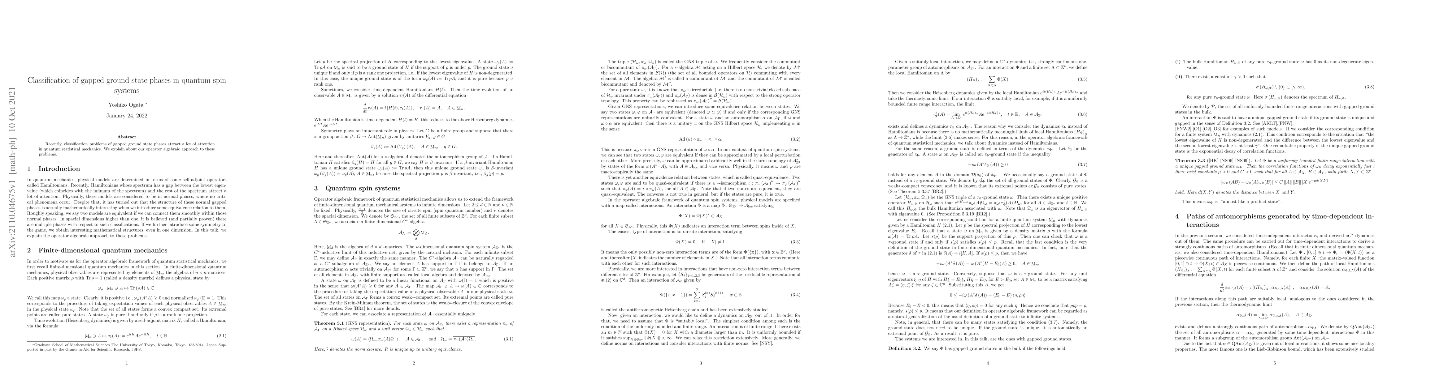 Summary: This paper presents an operator algebraic approach to classify gapped ground state phases in quantum spin systems, contributing to the ongoing research in quantum statistical mechanics. The methodology aims to provide a systematic framework for understanding these complex quantum states.