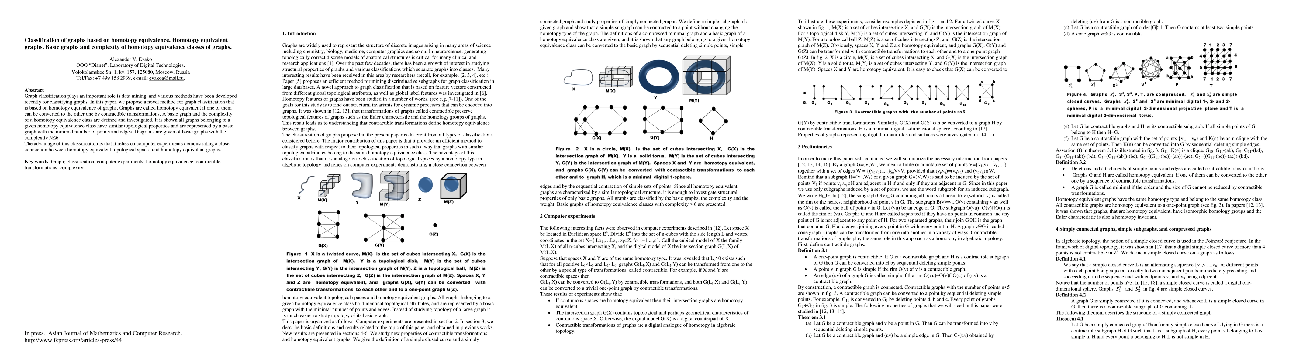 This paper proposes a novel graph classification method based on homotopy equivalence, where graphs are classified if they can be transformed into each other via contractible transformations. The study defines basic graphs and investigates the complexity of homotopy equivalence classes, showing that all graphs in a class share similar topological properties and are represented by a basic graph with minimal points and edges.