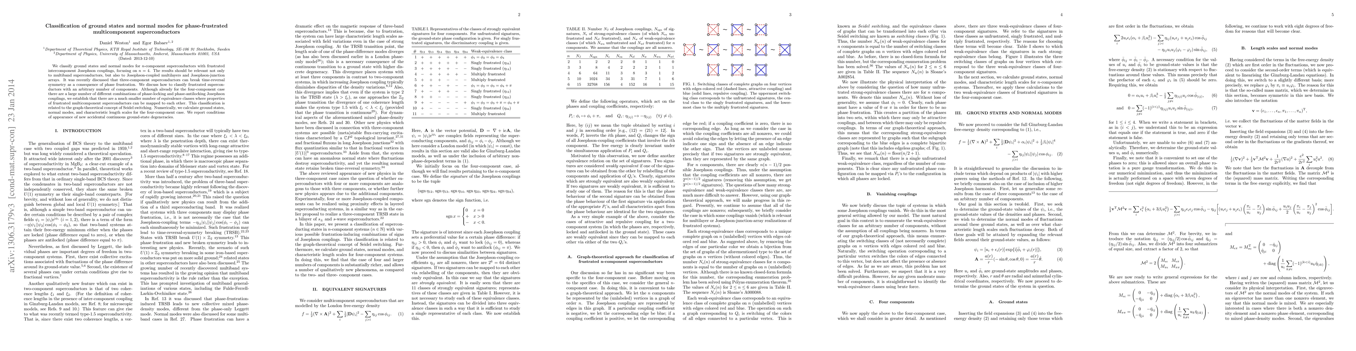 This paper classifies ground states and normal modes for four-component superconductors with frustrated Josephson couplings, revealing a smaller number of equivalence classes despite many coupling combinations. The findings are significant for multiband superconductors, multilayers, and junction arrays, and involve graph-theoretical concepts and numerical calculations.