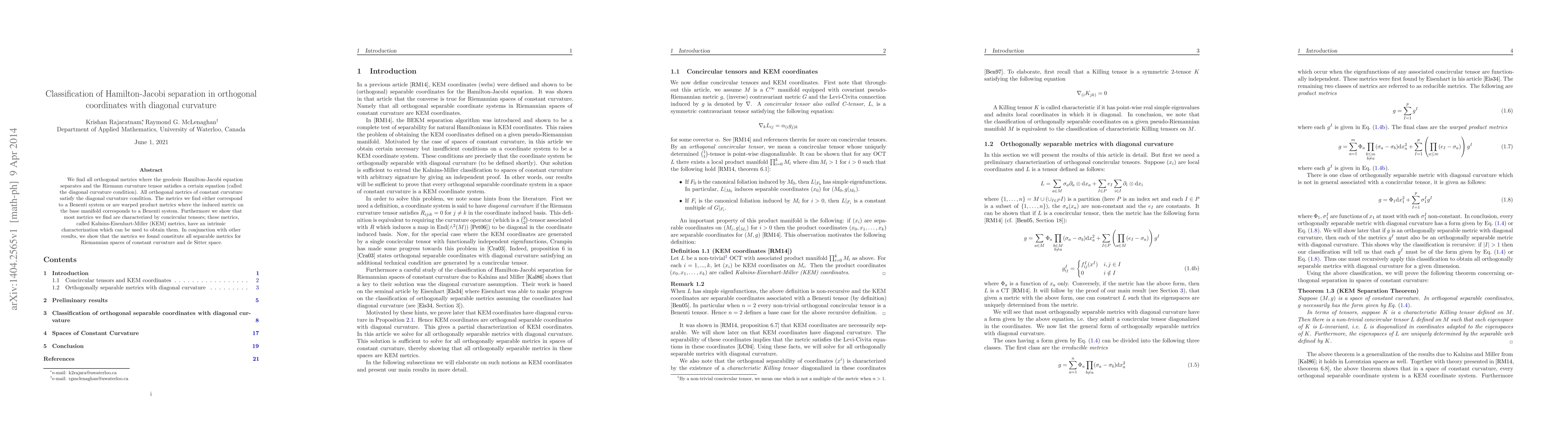 We find all orthogonal metrics where the geodesic Hamilton-Jacobi equation separates and the Riemann curvature tensor satisfies a certain equation (called the diagonal curvature condition). All orthogonal metrics of constant curvature satisfy the diagonal curvature condition. The metrics we find either correspond to a Benenti system or are warped product metrics where the induced metric on the base manifold corresponds to a Benenti system. Furthermore we show that most metrics we find are characterized by concircular tensors; these metrics, called Kalnins-Eisenhart-Miller (KEM) metrics, have an intrinsic characterization which can be used to obtain them. In conjunction with other results, we show that the metrics we found constitute all separable metrics for Riemannian spaces of constant curvature and de Sitter space.