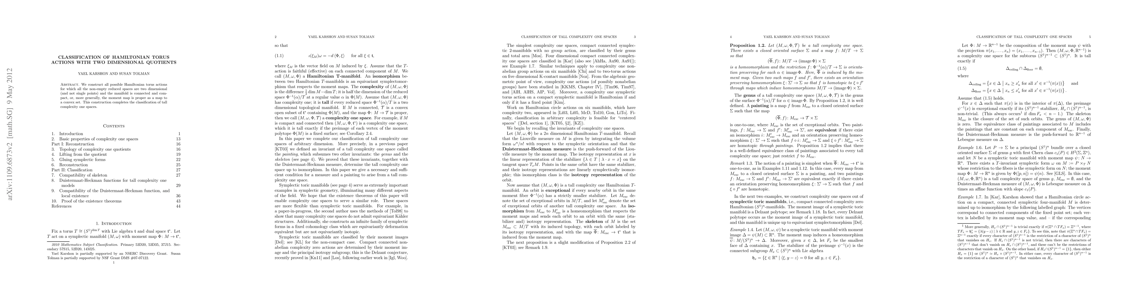 We construct all possible Hamiltonian torus actions for which all the non-empty reduced spaces are two dimensional (and not single points) and the manifold is connected and compact, or, more generally, the moment map is proper as a map to a convex set. This construction completes the classification of tall complexity one spaces.