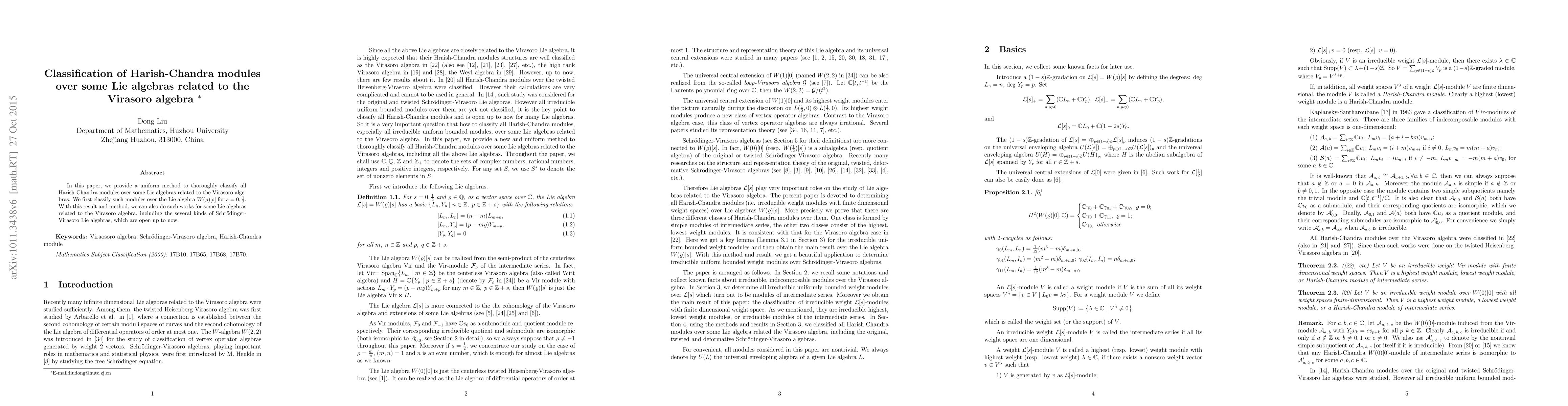 In this paper, we provide a uniform method to thoroughly classify all Harish-Chandra modules over some Lie algebras related to the Virasoro algebras. We first classify such modules over the Lie algebra $W(\varrho)[s]$ for $s=0,\frac12$. With this result and method, we can also do such works for some Lie algebras and superconformal algebras related to the Virasoro algebra, including the several kinds of Schr\"odinger-Virasoro Lie algebras, which are open up to now.