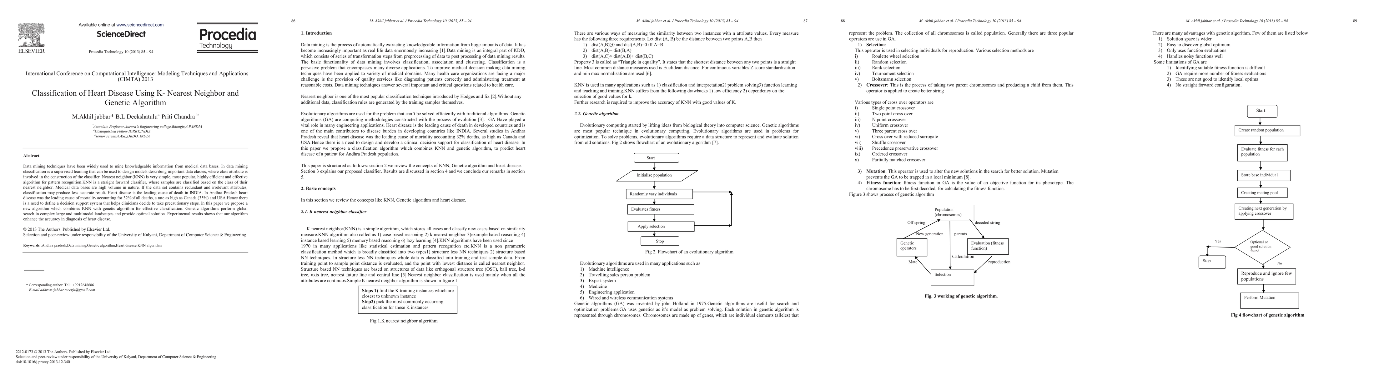 This paper proposes a hybrid algorithm combining K-Nearest Neighbor (KNN) and Genetic Algorithm for classifying heart disease from medical databases. The genetic algorithm enhances KNN by optimizing feature selection, leading to improved accuracy in diagnosing heart disease, crucial given its high mortality rate in Andhra Pradesh.
