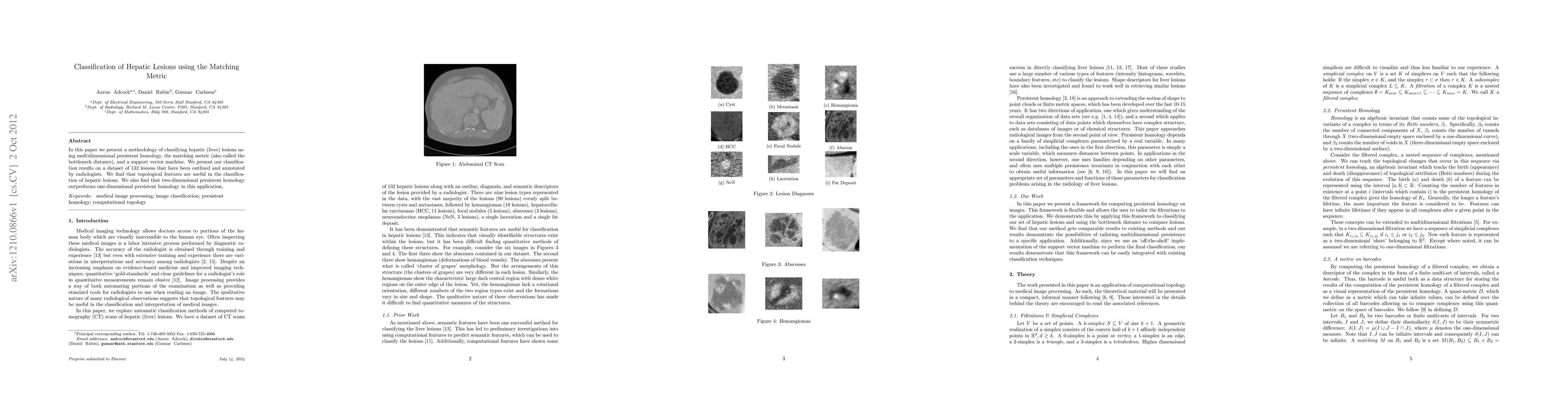 In this paper we present a methodology of classifying hepatic (liver) lesions using multidimensional persistent homology, the matching metric (also called the bottleneck distance), and a support vector machine. We present our classification results on a dataset of 132 lesions that have been outlined and annotated by radiologists. We find that topological features are useful in the classification of hepatic lesions. We also find that two-dimensional persistent homology outperforms one-dimensional persistent homology in this application.