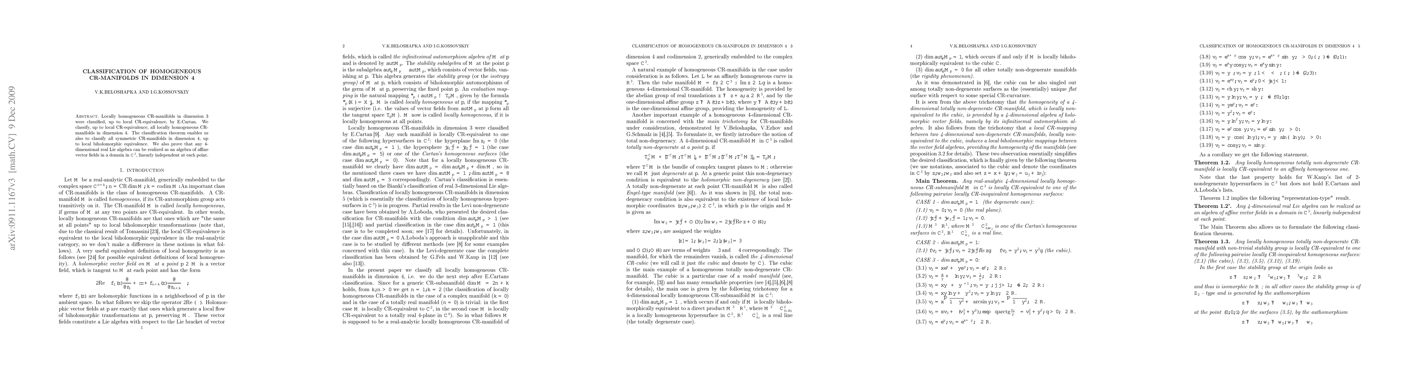 The paper classifies locally homogeneous CR-manifolds in dimension 4 up to local CR-equivalence, extending Cartan's classification for dimension 3, and also covers symmetric CR-manifolds in the same dimension up to local biholomorphic equivalence. Additionally, it proves that any 4-dimensional real Lie algebra can be represented as an algebra of affine vector fields in a domain in $\CC{3}$.