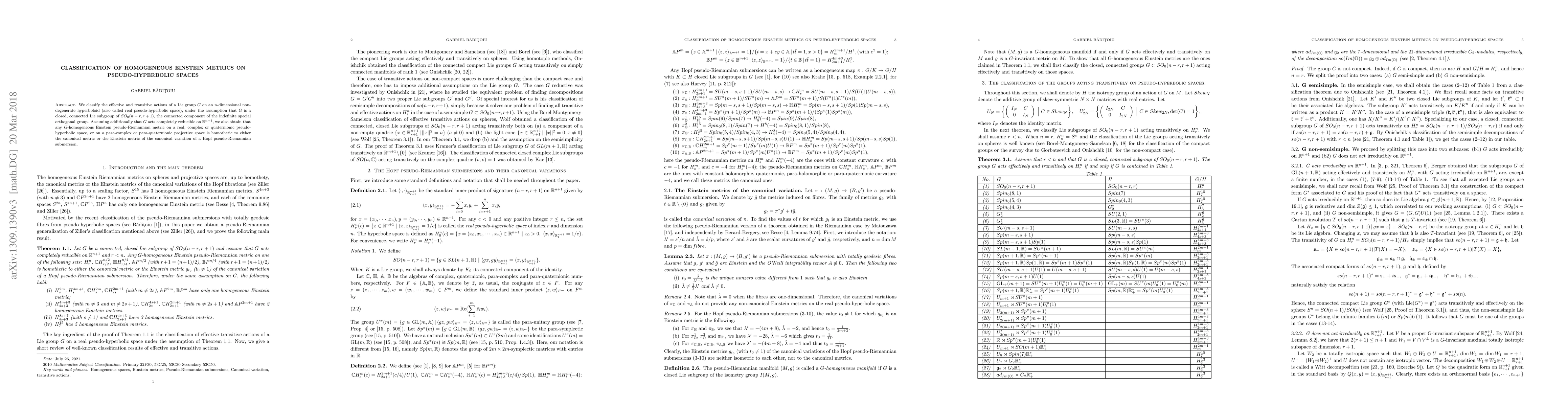 This paper classifies effective and transitive actions of Lie groups on pseudo-hyperbolic spaces, showing that $G$-homogeneous Einstein metrics under certain conditions are homothetic to canonical metrics or metrics from Hopf submersions. The classification assumes $G$ is a subgroup of $SO_0(n-r,r+1)$.