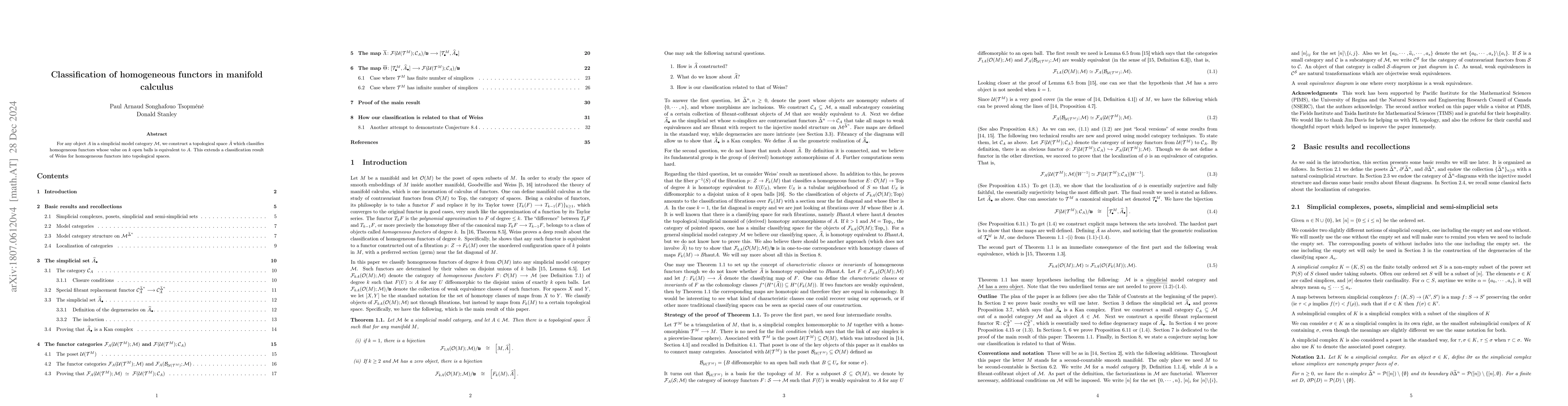This paper constructs a topological space \^A to classify linear functors in a simplicial model category C, showing a bijection between weak equivalence classes of functors from the poset category of open sets O(M) of a manifold M to C and homotopy classes of maps [M,\^A]. The findings extend to higher degree homogeneous functors and relate to Michael Weiss's classification result.