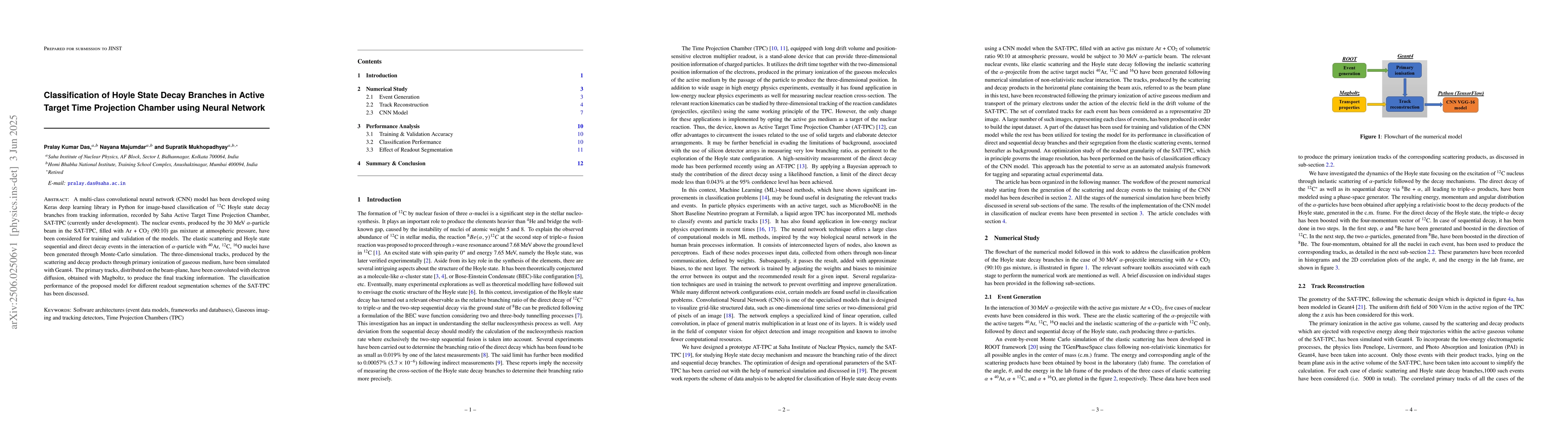 The development and implementation of a CNN model for image-based classification of Hoyle state decay branches using SAT-TPC tracking information.