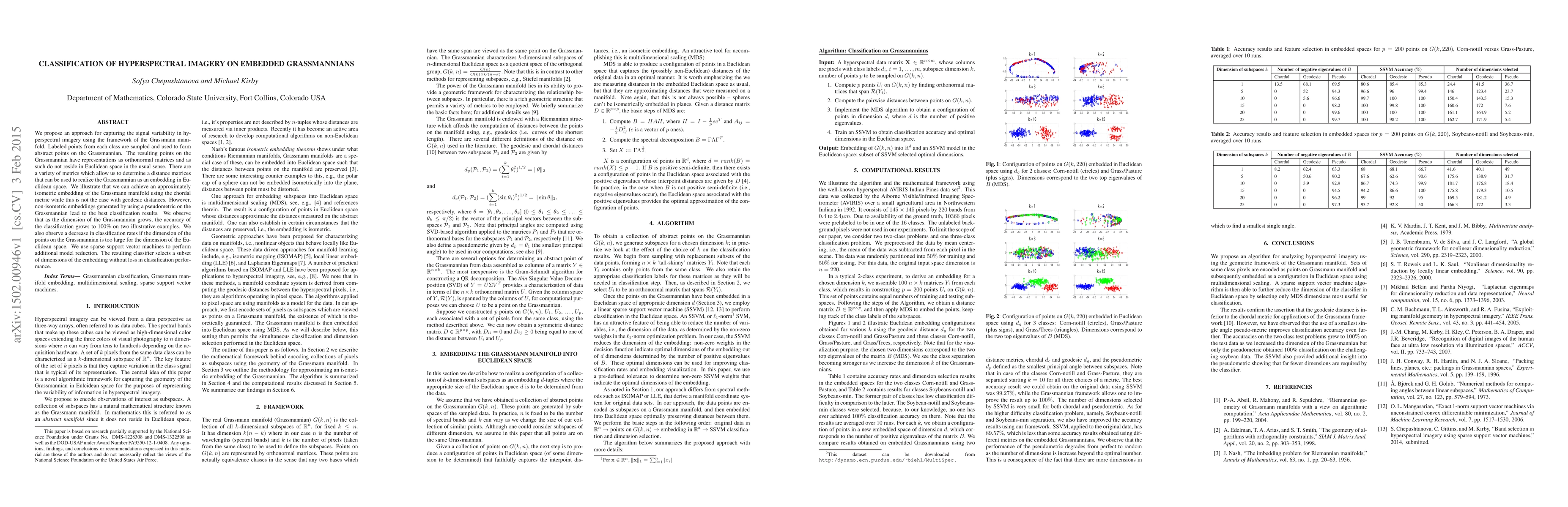 We propose an approach for capturing the signal variability in hyperspectral imagery using the framework of the Grassmann manifold. Labeled points from each class are sampled and used to form abstract points on the Grassmannian. The resulting points on the Grassmannian have representations as orthonormal matrices and as such do not reside in Euclidean space in the usual sense. There are a variety of metrics which allow us to determine a distance matrices that can be used to realize the Grassmannian as an embedding in Euclidean space. We illustrate that we can achieve an approximately isometric embedding of the Grassmann manifold using the chordal metric while this is not the case with geodesic distances. However, non-isometric embeddings generated by using a pseudometric on the Grassmannian lead to the best classification results. We observe that as the dimension of the Grassmannian grows, the accuracy of the classification grows to 100% on two illustrative examples. We also observe a decrease in classification rates if the dimension of the points on the Grassmannian is too large for the dimension of the Euclidean space. We use sparse support vector machines to perform additional model reduction. The resulting classifier selects a subset of dimensions of the embedding without loss in classification performance.