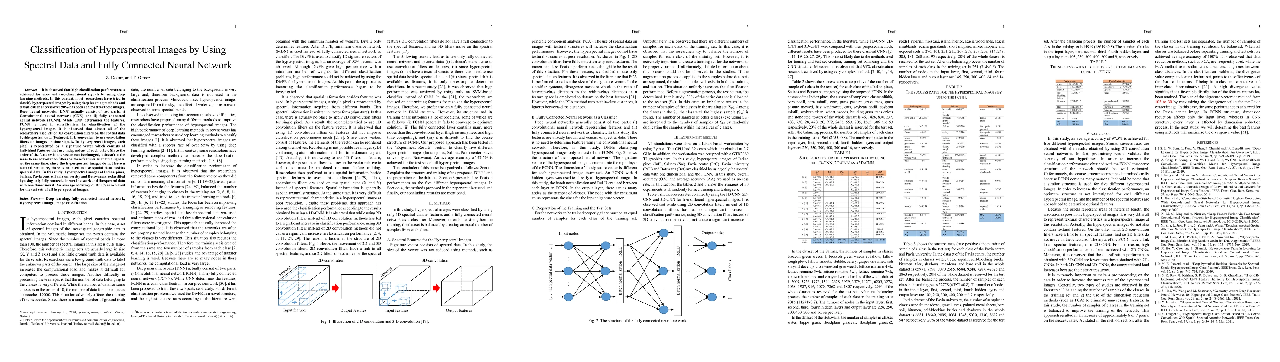 It is observed that high classification performance is achieved for one- and two-dimensional signals by using deep learning methods. In this context, most researchers have tried to classify hyperspectral images by using deep learning methods and classification success over 90% has been achieved for these images. Deep neural networks (DNN) actually consist of two parts: i) Convolutional neural network (CNN) and ii) fully connected neural network (FCNN). While CNN determines the features, FCNN is used in classification. In classification of the hyperspectral images, it is observed that almost all of the researchers used 2D or 3D convolution filters on the spatial data beside spectral data (features). It is convenient to use convolution filters on images or time signals. In hyperspectral images, each pixel is represented by a signature vector which consists of individual features that are independent of each other. Since the order of the features in the vector can be changed, it doesn't make sense to use convolution filters on these features as on time signals. At the same time, since the hyperspectral images do not have a textural structure, there is no need to use spatial data besides spectral data. In this study, hyperspectral images of Indian pines, Salinas, Pavia centre, Pavia university and Botswana are classified by using only fully connected neural network and the spectral data with one dimensional. An average accuracy of 97.5% is achieved for the test sets of all hyperspectral images.
