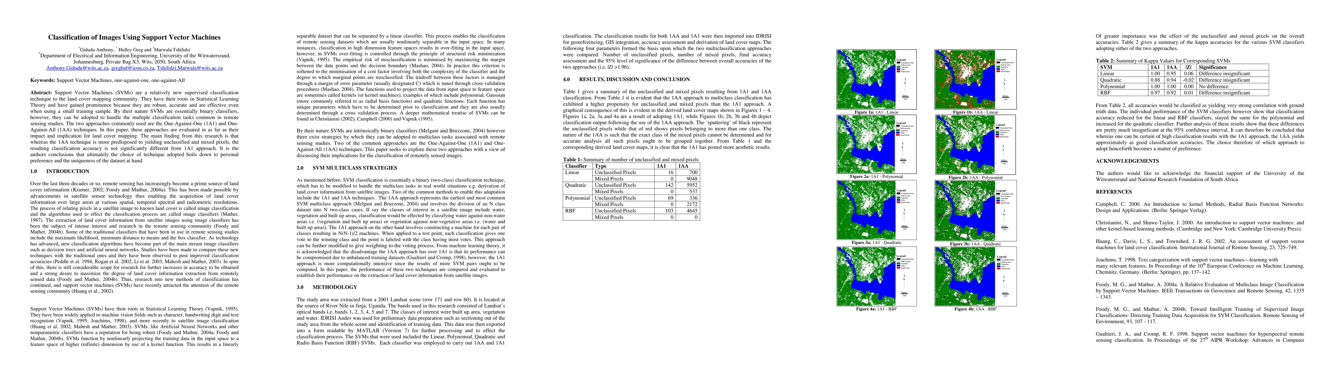 This paper evaluates the effectiveness of Support Vector Machines (SVMs) for image classification in land cover mapping, comparing the One-Against-One and One-Against-All techniques. The study concludes that while One-Against-All may produce more mixed pixels, both methods yield similar classification accuracy, suggesting the choice depends on dataset specifics and personal preference.