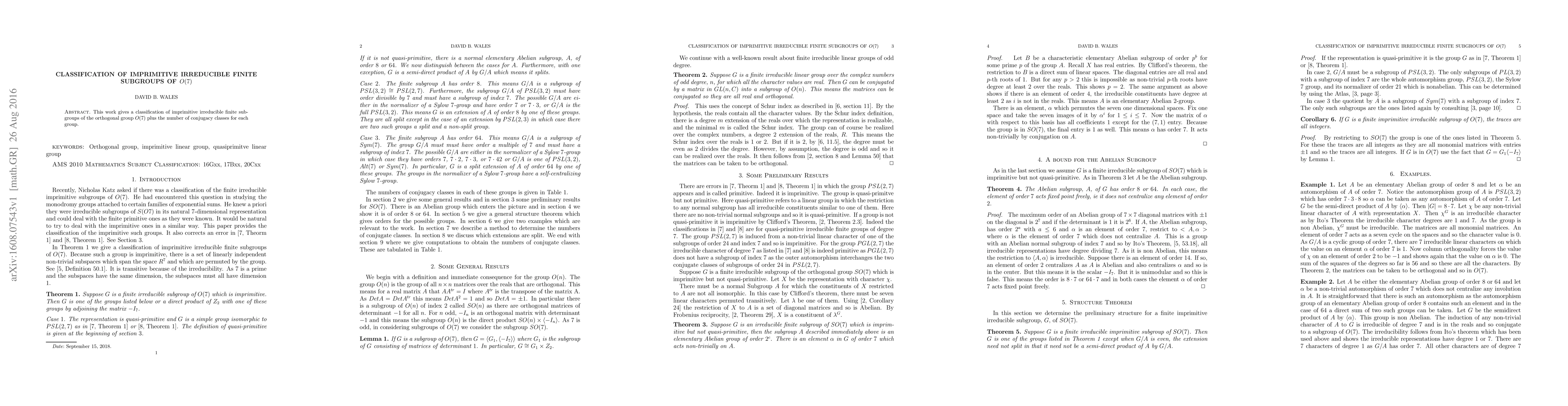 This paper classifies imprimitive irreducible finite subgroups of the orthogonal group O(7) and provides the count of conjugate classes for each subgroup. The detailed classification aids in understanding the structure and properties of these groups.