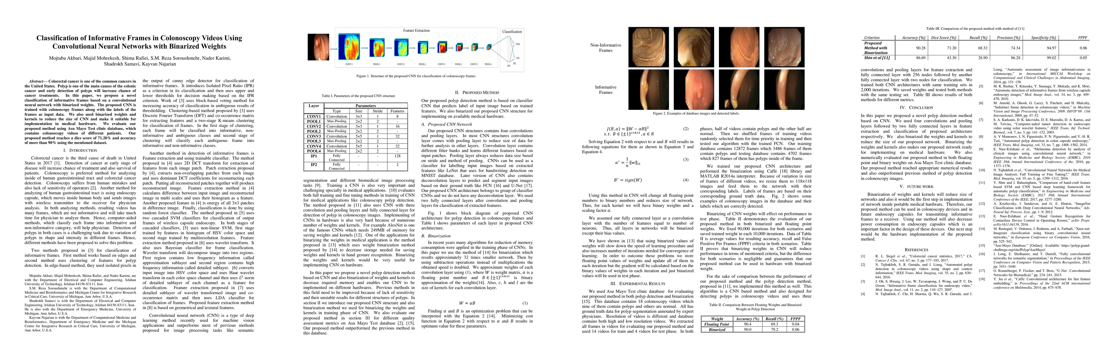 Colorectal cancer is one of the common cancers in the United States. Polyp is one of the main causes of the colonic cancer and early detection of polyps will increase chance of cancer treatments. In this paper, we propose a novel classification of informative frames based on a convolutional neural network with binarized weights. The proposed CNN is trained with colonoscopy frames along with the labels of the frames as input data. We also used binarized weights and kernels to reduce the size of CNN and make it suitable for implementation in medical hardware. We evaluate our proposed method using Asu Mayo Test clinic database, which contains colonoscopy videos of different patients. Our proposed method reaches a dice score of 71.20% and accuracy of more than 90% using the mentioned dataset.